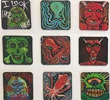 ANTHONY BEGNAL “Coasters” (4”x4”) acrylic on bar coasters ($150/ set of 10 or $15 each)