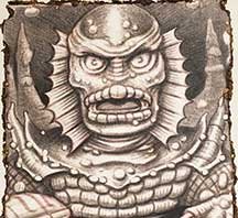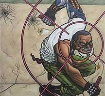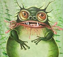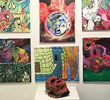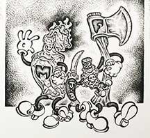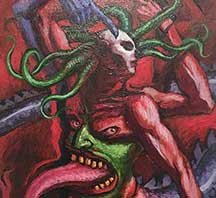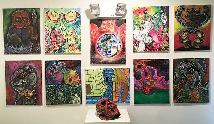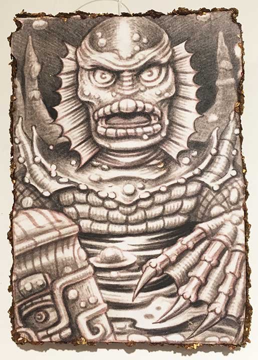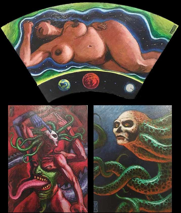 FRANK RUSSO “Musculoids Concept Art” (16”x20” acrylic on canvas (2 for $150) / “Musculoids & Skeletoids Card Art” (12”x22”, 14”x26”, 23”x29”) acrylic on paper / “Skeletoids Figures” (5.5”) rubber, resin (3 for $150) / “Various Heads” mixed media