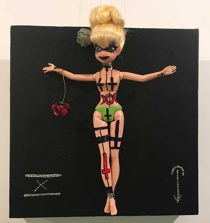 O_O “Tink Splattered VI- Unsafe” (12”x12”) mixed media krink, tinkerbell doll