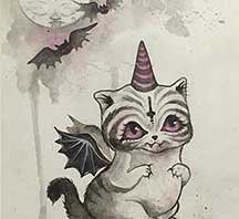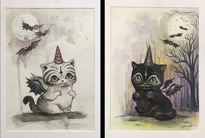 PHRESHA “Vam-Purrr Bat I & II” (5”x7” in 9”x12” frame) watercolor and ink on paper