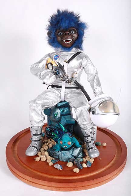 NECESARY NONSENSE - ALLY ATCHISON "Space Ape" posable GI Joe figure, sculpey, rabbit fur, beetle wings (3.5 x 12" figure 8" x 12" with dome) $160 no dome / $190 with dome EMAIL INFO@MFGALLERY.NET FOR AVAILABILITY / PURCHASE