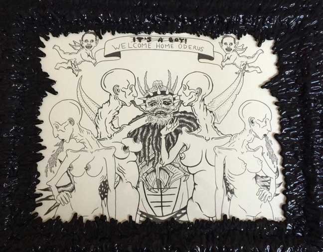 "Welcome Home” india ink on card stock, puff latex paint custom frame (11”x8.5”, 14”x12” framed) $100