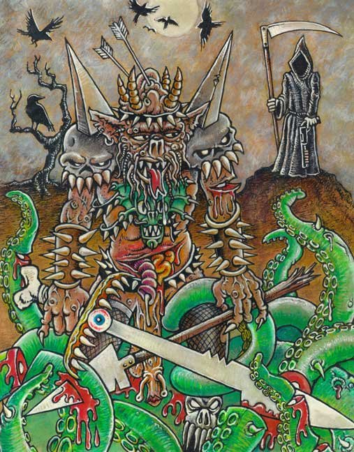 "The Last Battle” inks and colored pencils on paper hand tinted with beer, coffee, jagermeister and LSD (11”x14”) $500