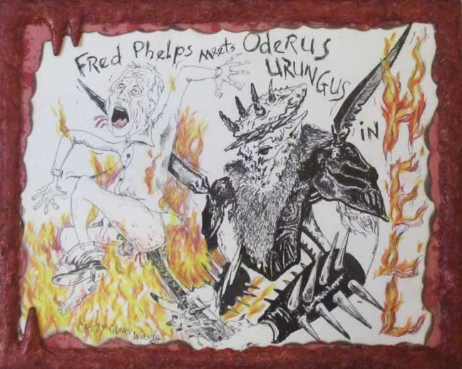 “Fred Phelps meets Oderus Urungus in HELL" mixed media with custom made frame $40