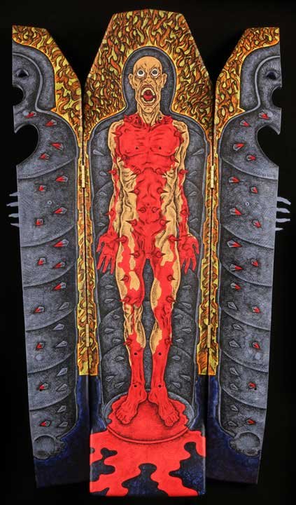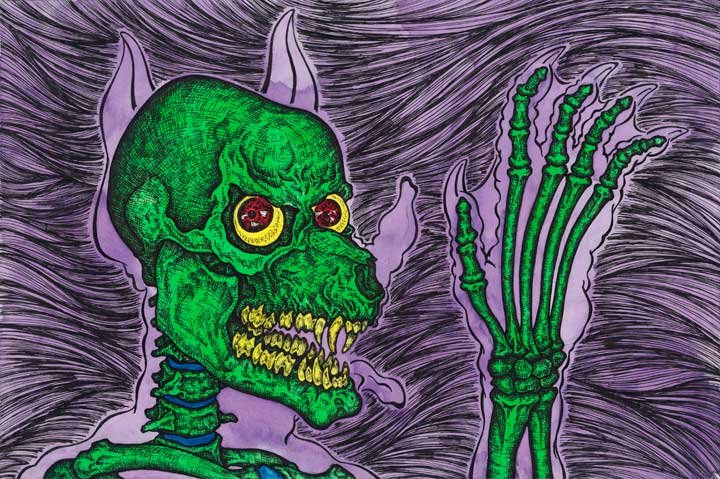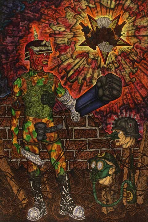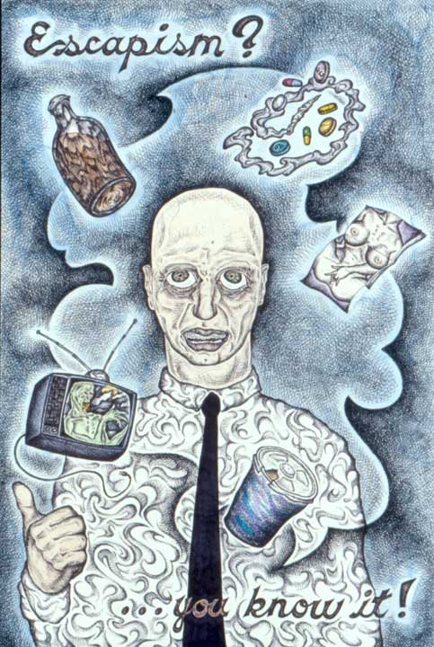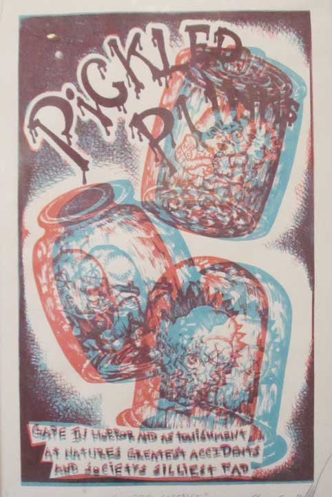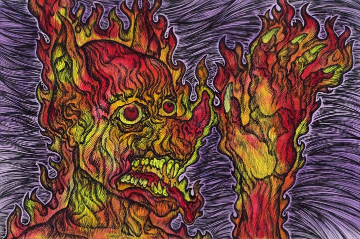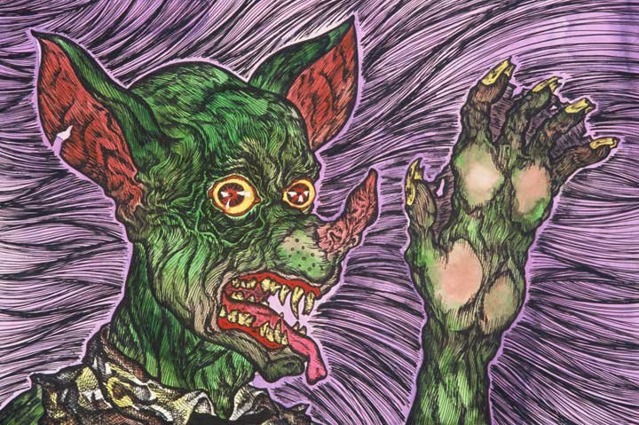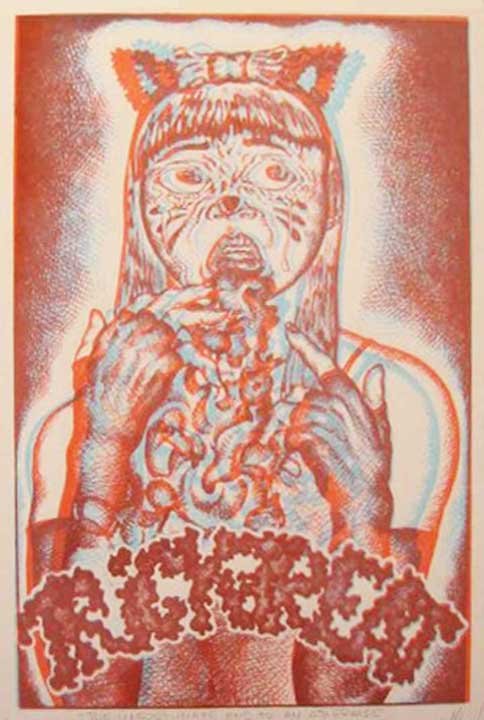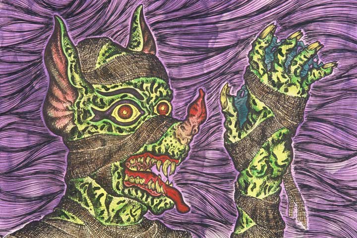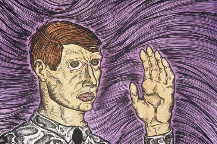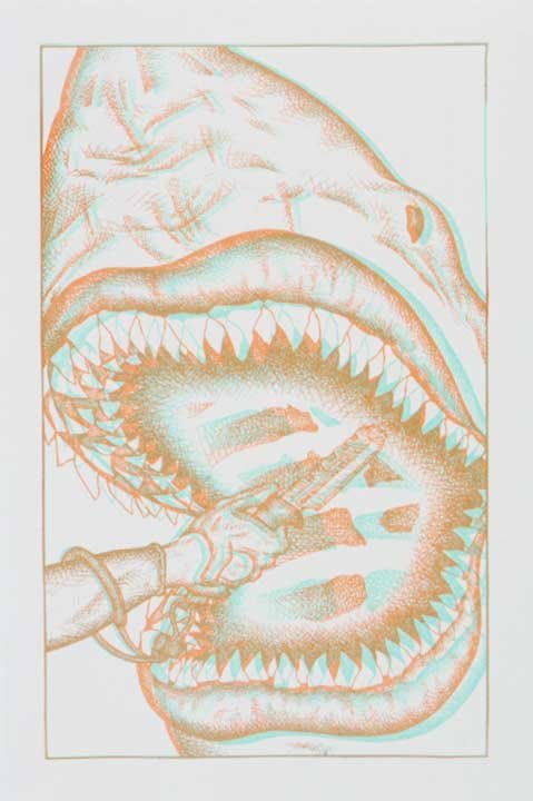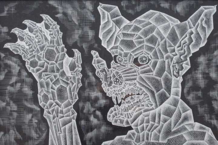 MF Gallery, fine purveyors of the eccentric and bizarre, are proud to present the collected works of one of their own. "Living In Interesting Times" is an exhibition of the drawings, paintings, prints and sculptures of Drew Maillard. There is an ancient Chinese curse that goes "May you live in interesting times." Drew Maillard was born and raised in America in the last quarter of the 20th century… A fascinating era to be sure. He is a product of his environment. Nature and nurture; habitat and conditioning combined. Drew’s adolescence was divided between comic books, horror and sci-fi films, and fantasizing about girls he didn’t talk to. Also there was Punk Rock and L.S.D.. After spending some time in the army and leaving his hometown in upstate NY, he received his Bachelor Of Fine Arts degree from SVA in 2000. His life experiences and travel, as well as an interest in scuba diving and ju-jitzu is what informs Drew’s crazy crazy artwork. Drew works in an originally distinctive style, which he creates with fervorous cross-hatching. He has been drawing near as long as he can remember, and shows no signs of letting up any time soon. He can spend days or months on a single drawing, hatching tiny little marks with a tiny little pen, or do a print edition start to finish in just one evening. Regardless of the choice of materials, he isn't afraid to get his hands dirty and jump in with both feet, head first. In the rising tide of media mediocrity and global standard cooling, it is necessary for someone to take a stand and proclaim in a loud forceful voice "This Shit Sucks!" And Drew will scream it from the rooftops... Figuratively and literally! At the Opening Party, Drew will be signing and drawing customized faces on special exclusive prints for only $30 each. He will also provide markers and give the audience a chance to customize their own prints. |