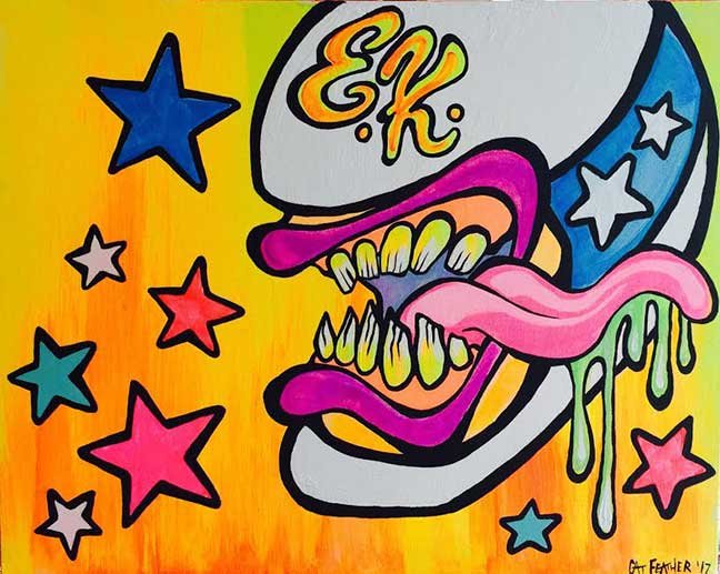 CAT FEATHER "Stunt Spirit" acrylic on canvas (16”x20”) $200 EMAIL INFO@MFGALLERY.NET FOR AVAILABILITY / PURCHASE