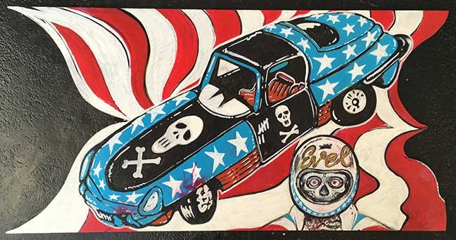 FRANK RUSSO “Evel A.D.” enamel on kamaka fiber board $150 EMAIL INFO@MFGALLERY.NET FOR AVAILABILITY / PURCHASE