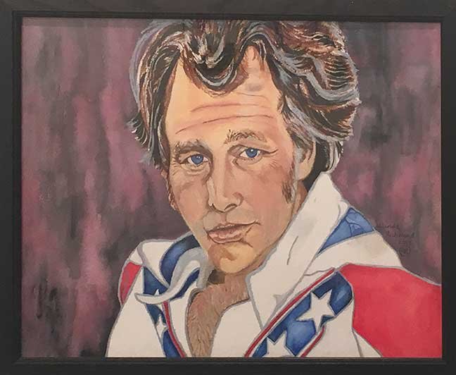 “Evel Knievel” watercolor on illustration board, framed (16”x12”) $350