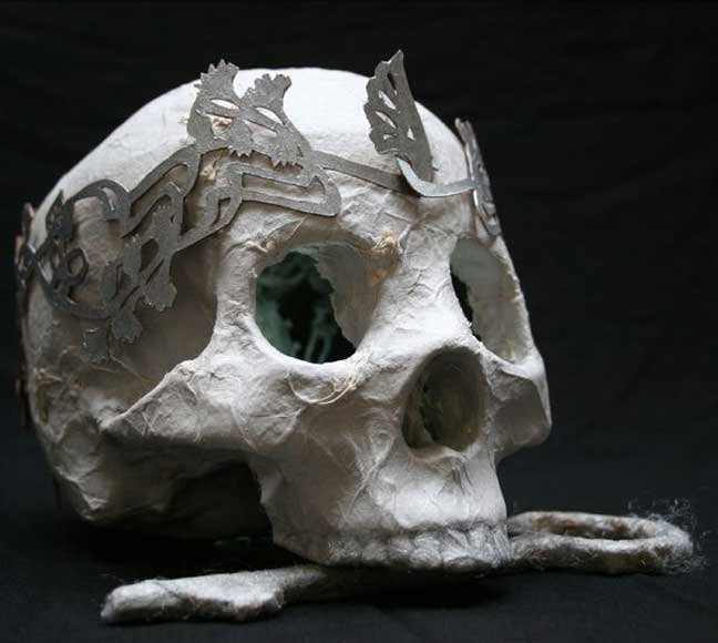 "Vanitas IV : Ghost House” Mixed Media- incl. Paper skull diorama, hand-cut wood, LED light(Approx. 7"x6"x7") $700