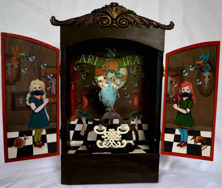 "Ari 'N Ira” two headed parakeet taxidermy, acrylic on mahogany, resin, hardware (17"x15"x3.5") $650