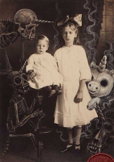 “The Unicorns” acrylic on antique photo, wax seal (4”x5.5”, 9”x11” in frame) $200