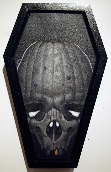 “Skullington” acrylic on custom made coffin shaped canvas $325