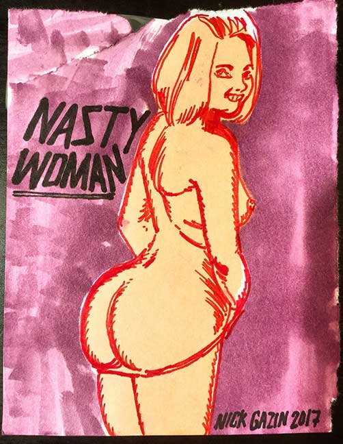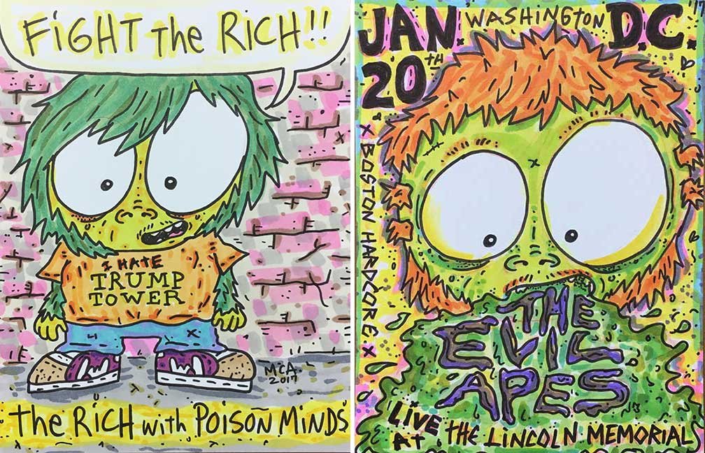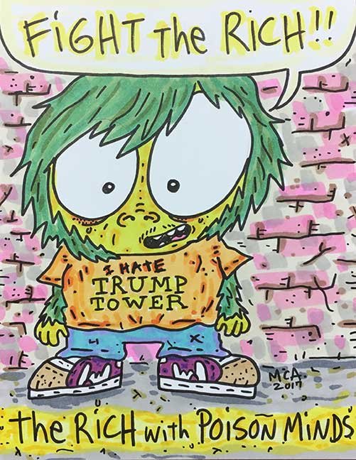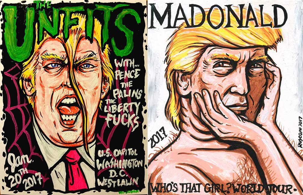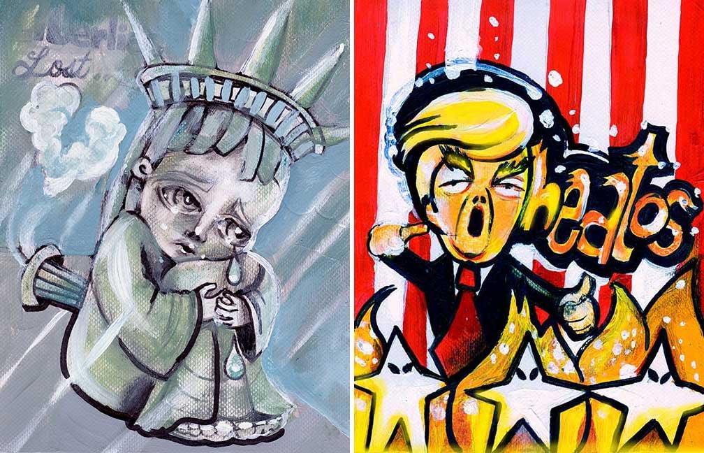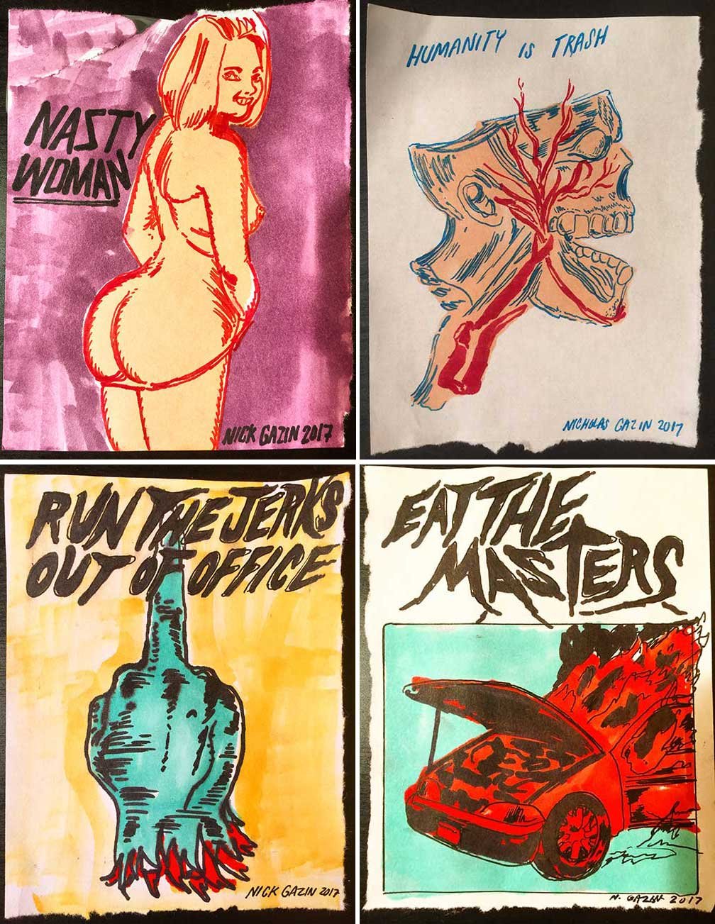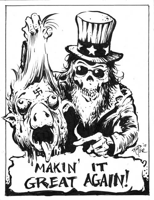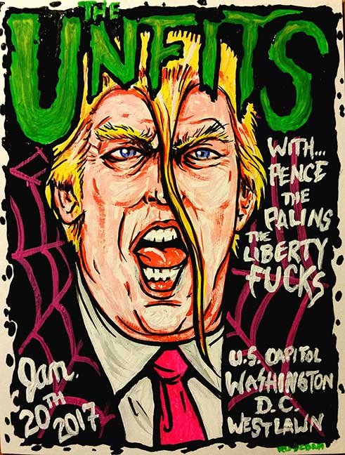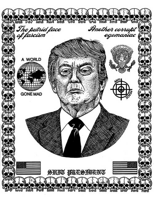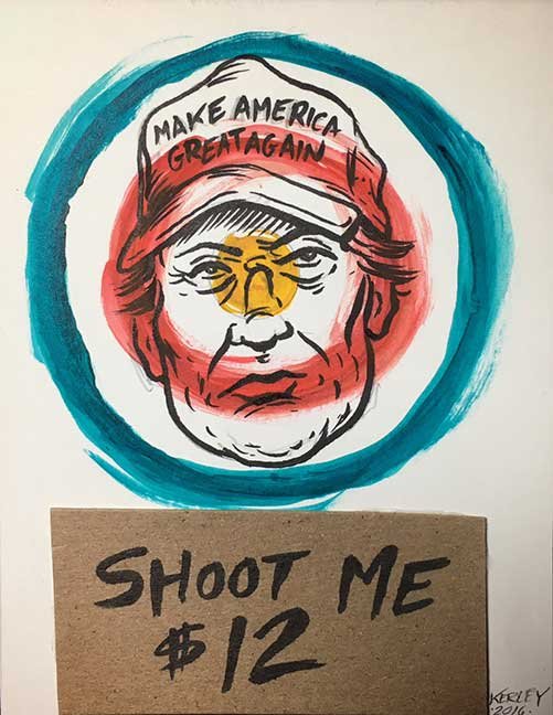 ABE LINCOLN JR. "Fuck This" pen and ink on postal label ADAM SUERTE "Introducing, The Next 4 Years" pen and ink ALEX HEIR "Shit President" xerox on cardstock, edition of 5 - $20 each ALLISON SOMMERS "Mister J" mixed media with collage on paper ALYSSA FANNING "NO WAR" watercolor on paper ANGIE MASON "Cheatos" ink, acrylic and pencil on board ANGIE MASON "Liberties Lost" ink, acrylic and pencil on board ANSIS PURINS "Howl At The Buffoon" ink and sharpie marker ARIK ROPER "Makin' It Great Again" pen on paper AUDREY RYAN "Pills" oil on canvas AYA KAKEDA "Nasty Woman 1" porcelain and ceramic glaze AYA KAKEDA "Nasty Woman 2" porcelain and ceramic glaze AYA KAKEDA "Nasty Woman 3" porcelain and ceramic glaze BECCA GENNE-BACON "Untitled" watercolor and ink BEN CAMPBELL "Tsar Bomba" acrylic and ink on paper BEN CAMPBELL "Eat The Fear" acrylic and ink on paper BEN CAMPBELL "Traditions" acrylic and ink on paper BEN CAMPBELL "Don't Ignore Violence" acrylic and ink on paper BEN CAMPBELL "Evil Days" acrylic and ink on paper BEN CAMPBELL "Troll Empire" acrylic and ink on paper BEN CAMPBELL "Don't Give Into Fear" acrylic and ink on paper BEN CAMPBELL "Leaf Blood" acrylic and ink on paper CHANTAL SMITH "Invisible" black bic pen, acrylic gold marker, fire CHRIS KINSLER "Untitled" collage (framed) CRISTY C. ROAD "Severed Head Of The State" ink, marker and gel pens (framed) DAMARA KAMINECKI "Eagle 2" ink, liquid acrylic DAMARA KAMINECKI "Tiger" ink, liquid acrylic DAMARA KAMINECKI "Eagle 1" ink, liquid acrylic DANIELLA AKA OUR LADY OF PERPETUAL PMS "Deliver Us From Evil" mixed media and collage DREW LINDEN "No Man's Land" liquid acrylic and ink on arches watercolor paper (framed) DREW LINDEN "Lending Hand" liquid acrylic and ink on arches watercolor paper (framed) DREW LINDEN "Suffering Suffragette" liquid acrylic and ink on arches watercolor paper (framed) DREW MAILLARD "Don't Think Your Shit Don't Stink" ink on illustration board DREW MAILLARD "The Awful Truth" ink on illustration board DREW MAILLARD "Visual Aid; The Perspective Of The Oligarchy " ink on illustration board DYLAN SCHREIFELS "I'm Mad As Hell And I'm Not Going To Take It ANYMORE!" ink and watercolor on arches (framed) FERNANDO CARPANEDA "We Stand As One" acrylic on canvas (framed) FLY-O "Goodbye 2016" ink, pencil and watercolor on cardstock FLY-O "Free Speech" ink, pencil and watercolor on cardstock FLY-O "Goodbye 2016 2" ink, pencil and watercolor on cardstock FLY-O "Crime Scene" sharpie and tape on cardstock FLY-O "Future Now Crime" sharpie and tape on cardstock GLENN WERNIG "We Are Evolved From Filthy Monkeymen, Some Are Just Less Evolved Than Others 1" clear resin, mixed media GLENN WERNIG "You Knew He Was A Snake... When You Voted" clear resin, mixed media GLENN WERNIG "We Are Evolved From Filthy Monkeymen, Some Are Just Less Evolved Than Others 2" clear resin, mixed media GRACE LANG "Screw The Boys Club" ink on paper GREG MAILLARD "Jesus Loves You But I May Not" bic pens on paper (framed) GREG MISHKA "A Day Of Death" collage HEATHER GARGON "Trump And Judy" sculpey, fabric and cardboard IAIN BURKE "Built To Last" ink and watercolor on arches watercolor paper JANE KENNEDY "Help Yourself" watercolor (framed) JASON MITCHELL "I Object 1" ink on bristol JASON MITCHELL "I Object 2" ink on bristol JASON MITCHELL "I Object 3" ink on bristol JASON MITCHELL "I Object 4" ink on bristol JENNIFER TROK "Steadfast" watercolor and ink JENNY GONZALEZ-BLITZ "Alma De Bruja" mixed media (framed) JENNY GONZALEZ-BLITZ "Resistance With Love" mixed media (framed) JEREMY HUSH "In The Shadow" biro and watercolor (framed) JUSTIN MELKMANN "Good To The Last Note" sharpie and photoshop (framed) JUSTIN MELKMANN "80s Night" sharpie and photoshop (framed) JUSTIN MELKMANN "Rock-A-Rolla Car-A-Showa" sharpie and photoshop (framed) KELLY DENATO "Nasty Woman" digital prints and mixed media on watercolor paper KELLY DENATO "Love Your Fellow Human Beans" digital prints and mixed media on watercolor paper KELLY DENATO "Eat Sh*t With A Smile" digital prints and mixed media on watercolor paper KIRSTEN FLAHERTY "2020" ink on handmade paper KRISTIN RYAN SHEA "Oh Shit... I Can't Find My Woman Card" ink and crowquill on bristol KRISTIN RYAN SHEA "History Repeats Itself" ink and crowquill on bristol KRISTIN RYAN SHEA "It's Huge, Tremendous" ink and crowquill on bristol KRISTIN RYAN SHEA "Where Are Your Papers" ink and crowquill on bristol KRISTIN RYAN SHEA "This Isn't What It Looks Like" ink and crowquill on bristol KRISTIN RYAN SHEA "There,There. Worry Not That Feeling Will Pass" ink and crowquill on bristol KRISTIN RYAN SHEA "Rolling In Their Graves" ink and crowquill on bristol KRISTIN RYAN SHEA "That Big Asteroid Is Still Coming" ink and crowquill on bristol KRISTIN RYAN SHEA "It's Only A Cluster Of Cells" ink and crowquill on bristol LAURA REBEL ANGEL "Earth Vs. The Short Vulgarians" ink and colored pencil on bristol LOU RUSCONI "Madonald" acrylic on heavy duty bristol board (framed) LOU RUSCONI "The Unfits" acrylic on heavy duty bristol board (framed) LUCY KNISLEY "The Game Plan" postcard prints, edition of 50 - $10 each MAGGIE SERPICA "Hola Monkey" acrylic and ink on illustration board MARIE SENA "She's On The Warpath" ink on paper (framed) MARTIN MAZORA "E.N.G.A.G.E." letterpress on 118 lb reich cavoy Cover MARTINA SECONDO RUSSO "2020 (Captain Spaulding)" acrylic on board (framed) MARTINA SECONDO RUSSO "2020 (Leatherface)" acrylic on board (framed) MATT KERLEY "Shoot Me" ink on bristol and cardboard MAX FRACHETTE "Make America Taste Great Again: Bannon" wood cut on watercolor paper MAX FRACHETTE "Make America Taste Great Again: Trump" wood cut on watercolor paper MAX FRACHETTE "Make America Taste Great Again: Wayne" wood cut on watercolor paper MCA "Fight the Rich" ink and copic markers on bristol board MCA "Evil Apes Live In DC" ink and copic markers on bristol board MICHAEL MICHAEL MOTORCYCLE "As if He Were a Prince, Others Will Mount His Stairs and Will Help Him to Descend 
