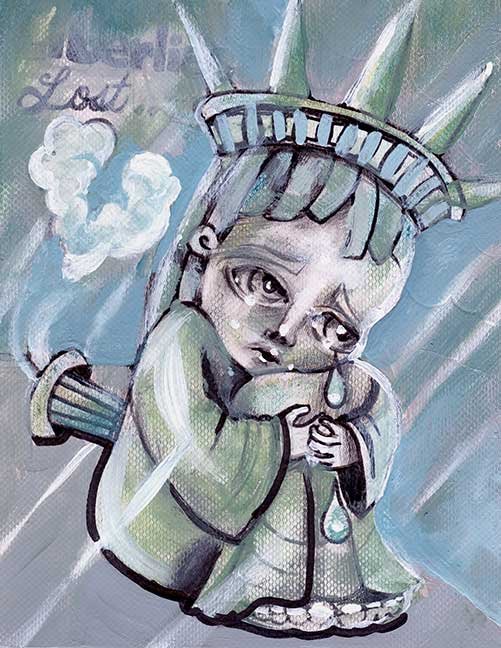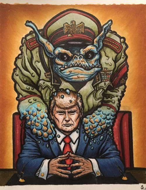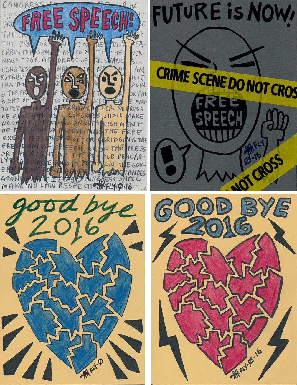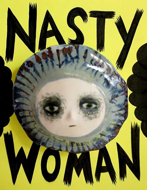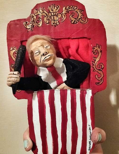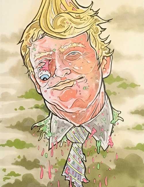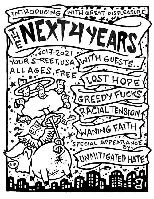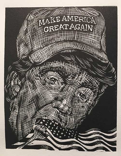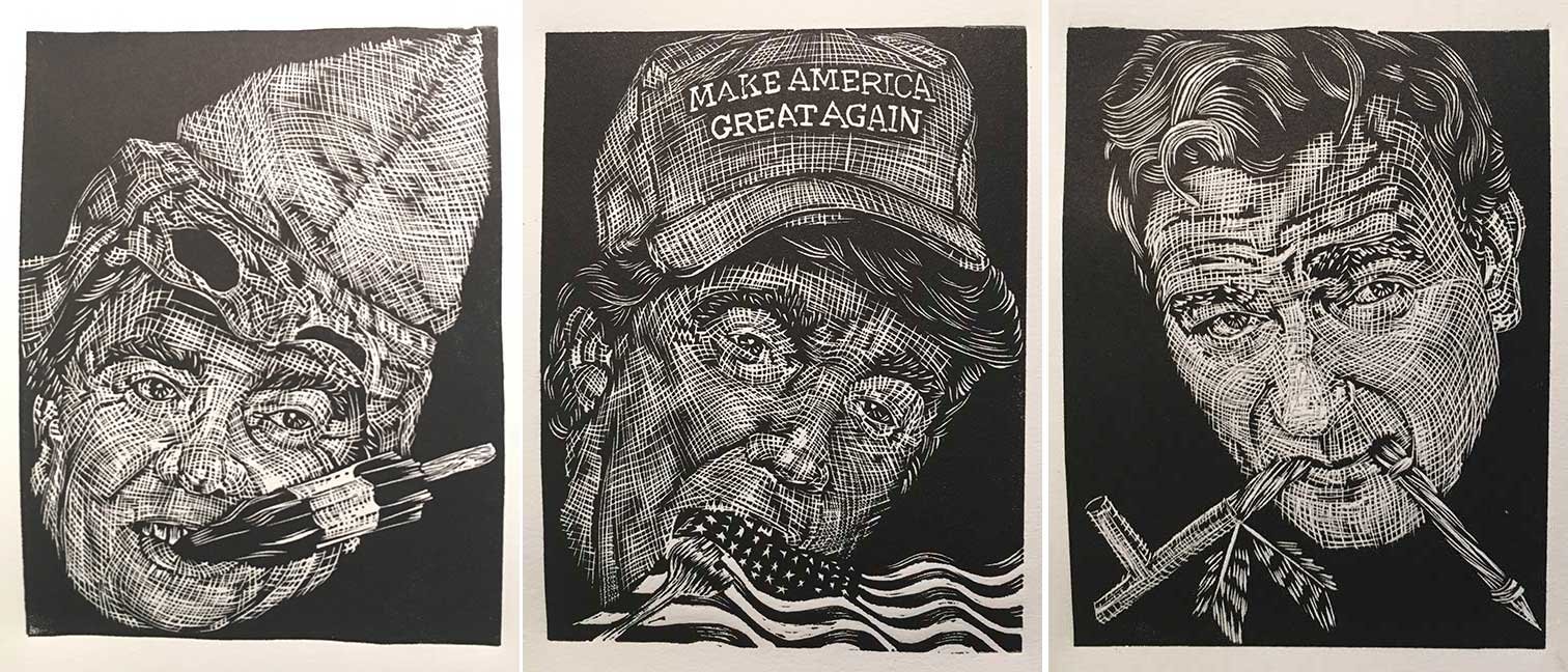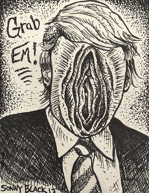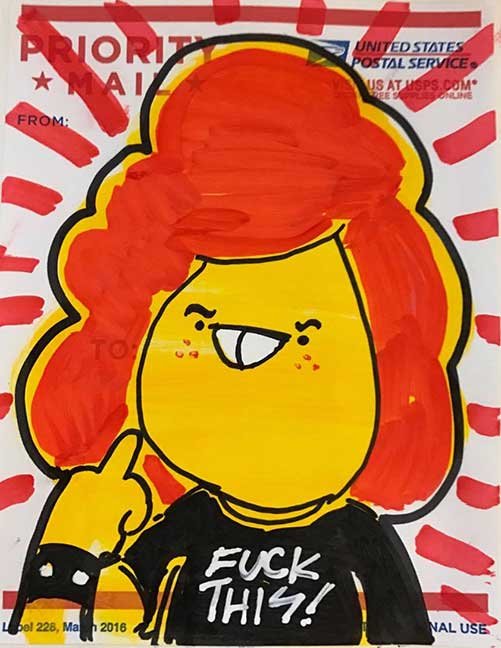 ABE LINCOLN JR. "Fuck This" pen and ink on postal label ADAM SUERTE "Introducing, The Next 4 Years" pen and ink ALEX HEIR "Shit President" xerox on cardstock, edition of 5 - $20 each ALLISON SOMMERS "Mister J" mixed media with collage on paper ALYSSA FANNING "NO WAR" watercolor on paper ANGIE MASON "Cheatos" ink, acrylic and pencil on board ANGIE MASON "Liberties Lost" ink, acrylic and pencil on board ANSIS PURINS "Howl At The Buffoon" ink and sharpie marker ARIK ROPER "Makin' It Great Again" pen on paper AUDREY RYAN "Pills" oil on canvas AYA KAKEDA "Nasty Woman 1" porcelain and ceramic glaze AYA KAKEDA "Nasty Woman 2" porcelain and ceramic glaze AYA KAKEDA "Nasty Woman 3" porcelain and ceramic glaze BECCA GENNE-BACON "Untitled" watercolor and ink BEN CAMPBELL "Tsar Bomba" acrylic and ink on paper BEN CAMPBELL "Eat The Fear" acrylic and ink on paper BEN CAMPBELL "Traditions" acrylic and ink on paper BEN CAMPBELL "Don't Ignore Violence" acrylic and ink on paper BEN CAMPBELL "Evil Days" acrylic and ink on paper BEN CAMPBELL "Troll Empire" acrylic and ink on paper BEN CAMPBELL "Don't Give Into Fear" acrylic and ink on paper BEN CAMPBELL "Leaf Blood" acrylic and ink on paper CHANTAL SMITH "Invisible" black bic pen, acrylic gold marker, fire CHRIS KINSLER "Untitled" collage (framed) CRISTY C. ROAD "Severed Head Of The State" ink, marker and gel pens (framed) DAMARA KAMINECKI "Eagle 2" ink, liquid acrylic DAMARA KAMINECKI "Tiger" ink, liquid acrylic DAMARA KAMINECKI "Eagle 1" ink, liquid acrylic DANIELLA AKA OUR LADY OF PERPETUAL PMS "Deliver Us From Evil" mixed media and collage DREW LINDEN "No Man's Land" liquid acrylic and ink on arches watercolor paper (framed) DREW LINDEN "Lending Hand" liquid acrylic and ink on arches watercolor paper (framed) DREW LINDEN "Suffering Suffragette" liquid acrylic and ink on arches watercolor paper (framed) DREW MAILLARD "Don't Think Your Shit Don't Stink" ink on illustration board DREW MAILLARD "The Awful Truth" ink on illustration board DREW MAILLARD "Visual Aid; The Perspective Of The Oligarchy " ink on illustration board DYLAN SCHREIFELS "I'm Mad As Hell And I'm Not Going To Take It ANYMORE!" ink and watercolor on arches (framed) FERNANDO CARPANEDA "We Stand As One" acrylic on canvas (framed) FLY-O "Goodbye 2016" ink, pencil and watercolor on cardstock FLY-O "Free Speech" ink, pencil and watercolor on cardstock FLY-O "Goodbye 2016 2" ink, pencil and watercolor on cardstock FLY-O "Crime Scene" sharpie and tape on cardstock FLY-O "Future Now Crime" sharpie and tape on cardstock GLENN WERNIG "We Are Evolved From Filthy Monkeymen, Some Are Just Less Evolved Than Others 1" clear resin, mixed media GLENN WERNIG "You Knew He Was A Snake... When You Voted" clear resin, mixed media GLENN WERNIG "We Are Evolved From Filthy Monkeymen, Some Are Just Less Evolved Than Others 2" clear resin, mixed media GRACE LANG "Screw The Boys Club" ink on paper GREG MAILLARD "Jesus Loves You But I May Not" bic pens on paper (framed) GREG MISHKA "A Day Of Death" collage HEATHER GARGON "Trump And Judy" sculpey, fabric and cardboard IAIN BURKE "Built To Last" ink and watercolor on arches watercolor paper JANE KENNEDY "Help Yourself" watercolor (framed) JASON MITCHELL "I Object 1" ink on bristol JASON MITCHELL "I Object 2" ink on bristol JASON MITCHELL "I Object 3" ink on bristol JASON MITCHELL "I Object 4" ink on bristol JENNIFER TROK "Steadfast" watercolor and ink JENNY GONZALEZ-BLITZ "Alma De Bruja" mixed media (framed) JENNY GONZALEZ-BLITZ "Resistance With Love" mixed media (framed) JEREMY HUSH "In The Shadow" biro and watercolor (framed) JUSTIN MELKMANN "Good To The Last Note" sharpie and photoshop (framed) JUSTIN MELKMANN "80s Night" sharpie and photoshop (framed) JUSTIN MELKMANN "Rock-A-Rolla Car-A-Showa" sharpie and photoshop (framed) KELLY DENATO "Nasty Woman" digital prints and mixed media on watercolor paper KELLY DENATO "Love Your Fellow Human Beans" digital prints and mixed media on watercolor paper KELLY DENATO "Eat Sh*t With A Smile" digital prints and mixed media on watercolor paper KIRSTEN FLAHERTY "2020" ink on handmade paper KRISTIN RYAN SHEA "Oh Shit... I Can't Find My Woman Card" ink and crowquill on bristol KRISTIN RYAN SHEA "History Repeats Itself" ink and crowquill on bristol KRISTIN RYAN SHEA "It's Huge, Tremendous" ink and crowquill on bristol KRISTIN RYAN SHEA "Where Are Your Papers" ink and crowquill on bristol KRISTIN RYAN SHEA "This Isn't What It Looks Like" ink and crowquill on bristol KRISTIN RYAN SHEA "There,There. Worry Not That Feeling Will Pass" ink and crowquill on bristol KRISTIN RYAN SHEA "Rolling In Their Graves" ink and crowquill on bristol KRISTIN RYAN SHEA "That Big Asteroid Is Still Coming" ink and crowquill on bristol KRISTIN RYAN SHEA "It's Only A Cluster Of Cells" ink and crowquill on bristol LAURA REBEL ANGEL "Earth Vs. The Short Vulgarians" ink and colored pencil on bristol LOU RUSCONI "Madonald" acrylic on heavy duty bristol board (framed) LOU RUSCONI "The Unfits" acrylic on heavy duty bristol board (framed) LUCY KNISLEY "The Game Plan" postcard prints, edition of 50 - $10 each MAGGIE SERPICA "Hola Monkey" acrylic and ink on illustration board MARIE SENA "She's On The Warpath" ink on paper (framed) MARTIN MAZORA "E.N.G.A.G.E." letterpress on 118 lb reich cavoy Cover MARTINA SECONDO RUSSO "2020 (Captain Spaulding)" acrylic on board (framed) MARTINA SECONDO RUSSO "2020 (Leatherface)" acrylic on board (framed) MATT KERLEY "Shoot Me" ink on bristol and cardboard MAX FRACHETTE "Make America Taste Great Again: Bannon" wood cut on watercolor paper MAX FRACHETTE "Make America Taste Great Again: Trump" wood cut on watercolor paper MAX FRACHETTE "Make America Taste Great Again: Wayne" wood cut on watercolor paper MCA "Fight the Rich" ink and copic markers on bristol board MCA "Evil Apes Live In DC" ink and copic markers on bristol board MICHAEL MICHAEL MOTORCYCLE "As if He Were a Prince, Others Will Mount His Stairs and Will Help Him to Descend 