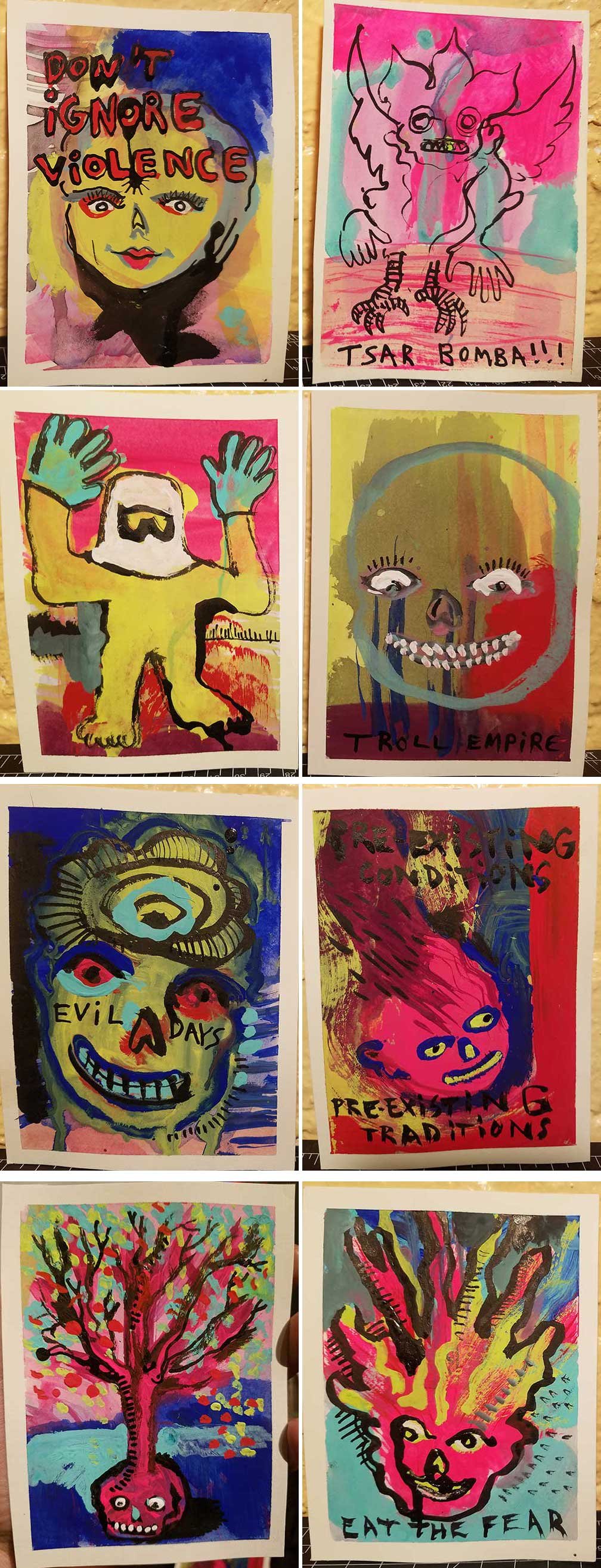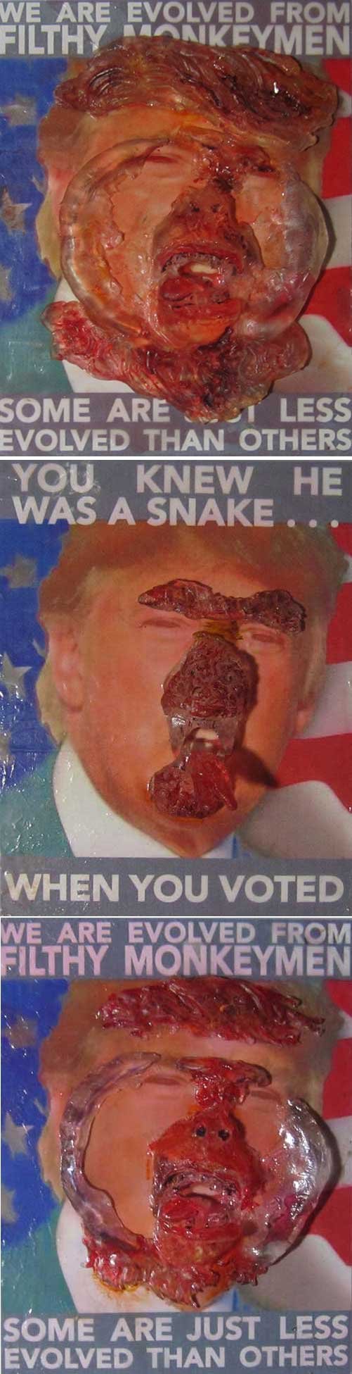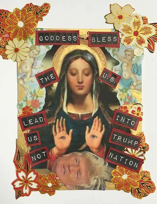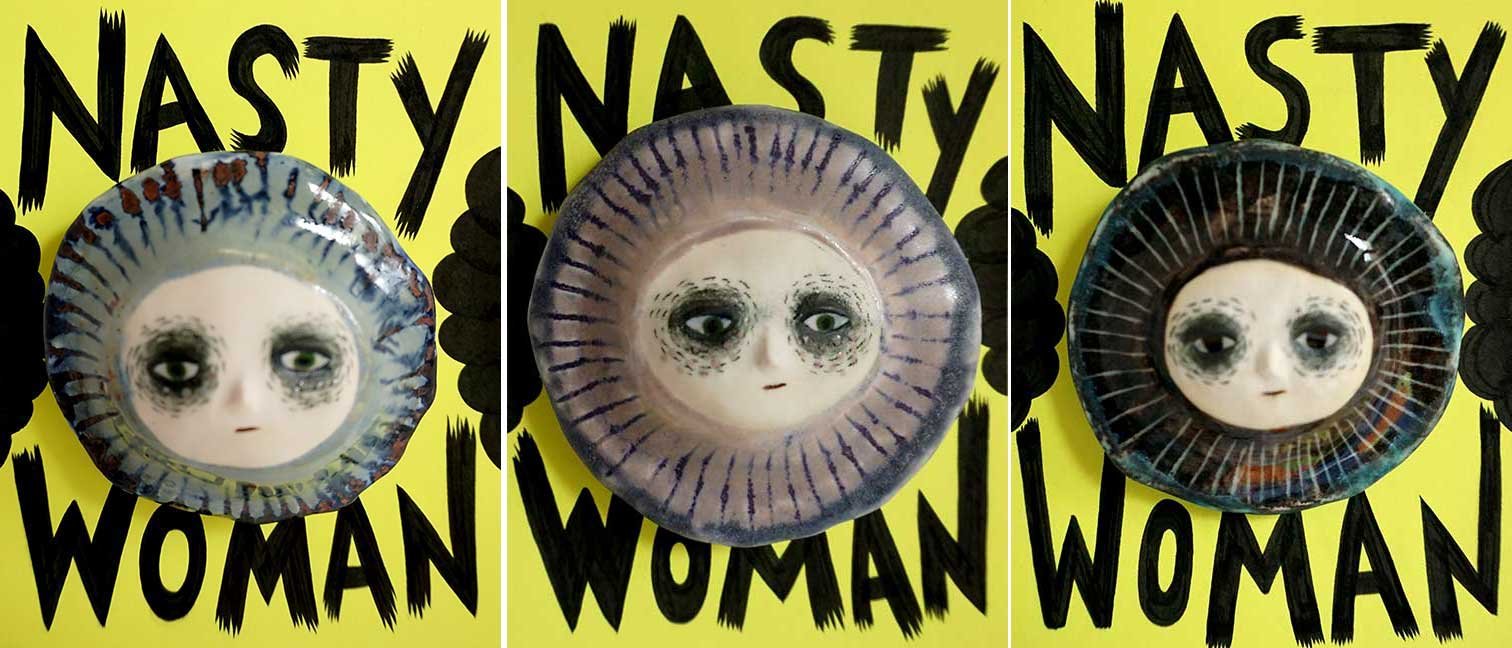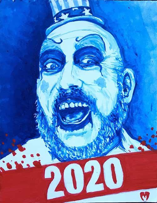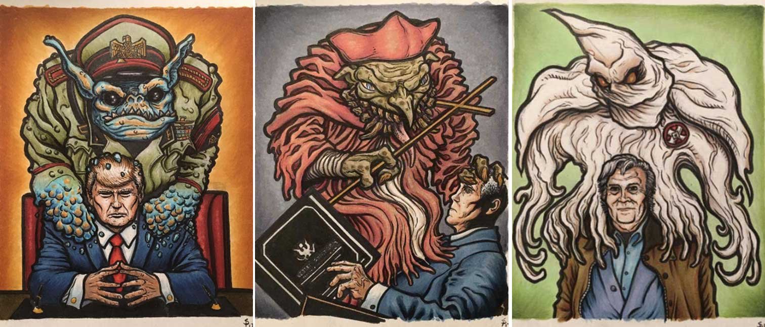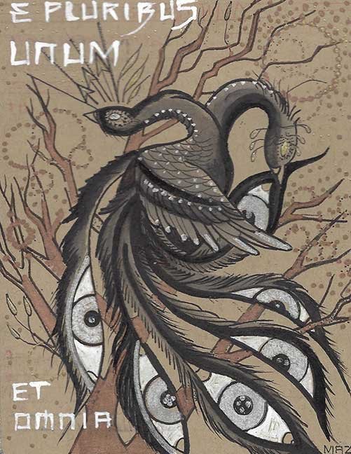 ABE LINCOLN JR. "Fuck This" pen and ink on postal label ADAM SUERTE "Introducing, The Next 4 Years" pen and ink ALEX HEIR "Shit President" xerox on cardstock, edition of 5 - $20 each ALLISON SOMMERS "Mister J" mixed media with collage on paper ALYSSA FANNING "NO WAR" watercolor on paper ANGIE MASON "Cheatos" ink, acrylic and pencil on board ANGIE MASON "Liberties Lost" ink, acrylic and pencil on board ANSIS PURINS "Howl At The Buffoon" ink and sharpie marker ARIK ROPER "Makin' It Great Again" pen on paper AUDREY RYAN "Pills" oil on canvas AYA KAKEDA "Nasty Woman 1" porcelain and ceramic glaze AYA KAKEDA "Nasty Woman 2" porcelain and ceramic glaze AYA KAKEDA "Nasty Woman 3" porcelain and ceramic glaze BECCA GENNE-BACON "Untitled" watercolor and ink BEN CAMPBELL "Tsar Bomba" acrylic and ink on paper BEN CAMPBELL "Eat The Fear" acrylic and ink on paper BEN CAMPBELL "Traditions" acrylic and ink on paper BEN CAMPBELL "Don't Ignore Violence" acrylic and ink on paper BEN CAMPBELL "Evil Days" acrylic and ink on paper BEN CAMPBELL "Troll Empire" acrylic and ink on paper BEN CAMPBELL "Don't Give Into Fear" acrylic and ink on paper BEN CAMPBELL "Leaf Blood" acrylic and ink on paper CHANTAL SMITH "Invisible" black bic pen, acrylic gold marker, fire CHRIS KINSLER "Untitled" collage (framed) CRISTY C. ROAD "Severed Head Of The State" ink, marker and gel pens (framed) DAMARA KAMINECKI "Eagle 2" ink, liquid acrylic DAMARA KAMINECKI "Tiger" ink, liquid acrylic DAMARA KAMINECKI "Eagle 1" ink, liquid acrylic DANIELLA AKA OUR LADY OF PERPETUAL PMS "Deliver Us From Evil" mixed media and collage DREW LINDEN "No Man's Land" liquid acrylic and ink on arches watercolor paper (framed) DREW LINDEN "Lending Hand" liquid acrylic and ink on arches watercolor paper (framed) DREW LINDEN "Suffering Suffragette" liquid acrylic and ink on arches watercolor paper (framed) DREW MAILLARD "Don't Think Your Shit Don't Stink" ink on illustration board DREW MAILLARD "The Awful Truth" ink on illustration board DREW MAILLARD "Visual Aid; The Perspective Of The Oligarchy " ink on illustration board DYLAN SCHREIFELS "I'm Mad As Hell And I'm Not Going To Take It ANYMORE!" ink and watercolor on arches (framed) FERNANDO CARPANEDA "We Stand As One" acrylic on canvas (framed) FLY-O "Goodbye 2016" ink, pencil and watercolor on cardstock FLY-O "Free Speech" ink, pencil and watercolor on cardstock FLY-O "Goodbye 2016 2" ink, pencil and watercolor on cardstock FLY-O "Crime Scene" sharpie and tape on cardstock FLY-O "Future Now Crime" sharpie and tape on cardstock GLENN WERNIG "We Are Evolved From Filthy Monkeymen, Some Are Just Less Evolved Than Others 1" clear resin, mixed media GLENN WERNIG "You Knew He Was A Snake... When You Voted" clear resin, mixed media GLENN WERNIG "We Are Evolved From Filthy Monkeymen, Some Are Just Less Evolved Than Others 2" clear resin, mixed media GRACE LANG "Screw The Boys Club" ink on paper GREG MAILLARD "Jesus Loves You But I May Not" bic pens on paper (framed) GREG MISHKA "A Day Of Death" collage HEATHER GARGON "Trump And Judy" sculpey, fabric and cardboard IAIN BURKE "Built To Last" ink and watercolor on arches watercolor paper JANE KENNEDY "Help Yourself" watercolor (framed) JASON MITCHELL "I Object 1" ink on bristol JASON MITCHELL "I Object 2" ink on bristol JASON MITCHELL "I Object 3" ink on bristol JASON MITCHELL "I Object 4" ink on bristol JENNIFER TROK "Steadfast" watercolor and ink JENNY GONZALEZ-BLITZ "Alma De Bruja" mixed media (framed) JENNY GONZALEZ-BLITZ "Resistance With Love" mixed media (framed) JEREMY HUSH "In The Shadow" biro and watercolor (framed) JUSTIN MELKMANN "Good To The Last Note" sharpie and photoshop (framed) JUSTIN MELKMANN "80s Night" sharpie and photoshop (framed) JUSTIN MELKMANN "Rock-A-Rolla Car-A-Showa" sharpie and photoshop (framed) KELLY DENATO "Nasty Woman" digital prints and mixed media on watercolor paper KELLY DENATO "Love Your Fellow Human Beans" digital prints and mixed media on watercolor paper KELLY DENATO "Eat Sh*t With A Smile" digital prints and mixed media on watercolor paper KIRSTEN FLAHERTY "2020" ink on handmade paper KRISTIN RYAN SHEA "Oh Shit... I Can't Find My Woman Card" ink and crowquill on bristol KRISTIN RYAN SHEA "History Repeats Itself" ink and crowquill on bristol KRISTIN RYAN SHEA "It's Huge, Tremendous" ink and crowquill on bristol KRISTIN RYAN SHEA "Where Are Your Papers" ink and crowquill on bristol KRISTIN RYAN SHEA "This Isn't What It Looks Like" ink and crowquill on bristol KRISTIN RYAN SHEA "There,There. Worry Not That Feeling Will Pass" ink and crowquill on bristol KRISTIN RYAN SHEA "Rolling In Their Graves" ink and crowquill on bristol KRISTIN RYAN SHEA "That Big Asteroid Is Still Coming" ink and crowquill on bristol KRISTIN RYAN SHEA "It's Only A Cluster Of Cells" ink and crowquill on bristol LAURA REBEL ANGEL "Earth Vs. The Short Vulgarians" ink and colored pencil on bristol LOU RUSCONI "Madonald" acrylic on heavy duty bristol board (framed) LOU RUSCONI "The Unfits" acrylic on heavy duty bristol board (framed) LUCY KNISLEY "The Game Plan" postcard prints, edition of 50 - $10 each MAGGIE SERPICA "Hola Monkey" acrylic and ink on illustration board MARIE SENA "She's On The Warpath" ink on paper (framed) MARTIN MAZORA "E.N.G.A.G.E." letterpress on 118 lb reich cavoy Cover MARTINA SECONDO RUSSO "2020 (Captain Spaulding)" acrylic on board (framed) MARTINA SECONDO RUSSO "2020 (Leatherface)" acrylic on board (framed) MATT KERLEY "Shoot Me" ink on bristol and cardboard MAX FRACHETTE "Make America Taste Great Again: Bannon" wood cut on watercolor paper MAX FRACHETTE "Make America Taste Great Again: Trump" wood cut on watercolor paper MAX FRACHETTE "Make America Taste Great Again: Wayne" wood cut on watercolor paper MCA "Fight the Rich" ink and copic markers on bristol board MCA "Evil Apes Live In DC" ink and copic markers on bristol board MICHAEL MICHAEL MOTORCYCLE "As if He Were a Prince, Others Will Mount His Stairs and Will Help Him to Descend 