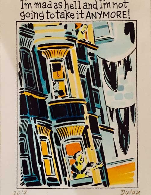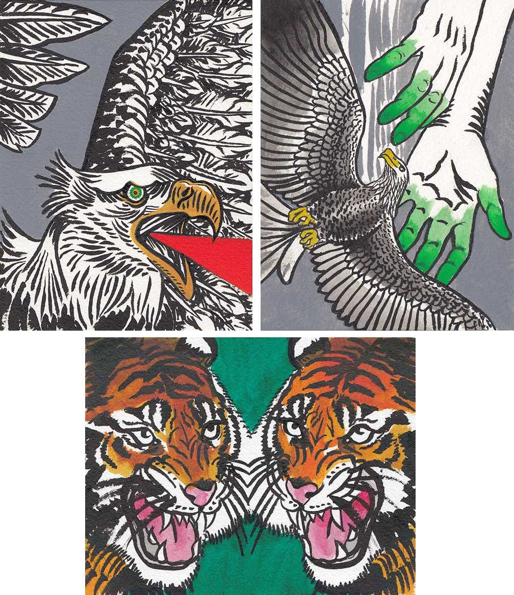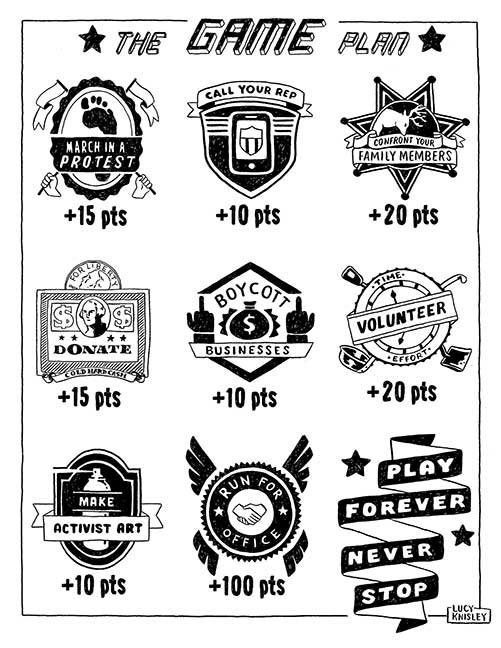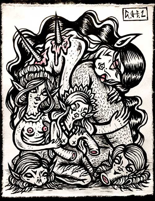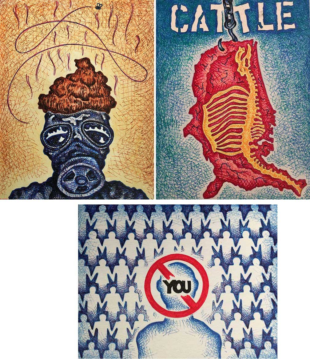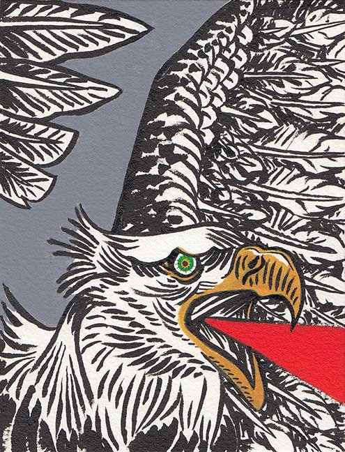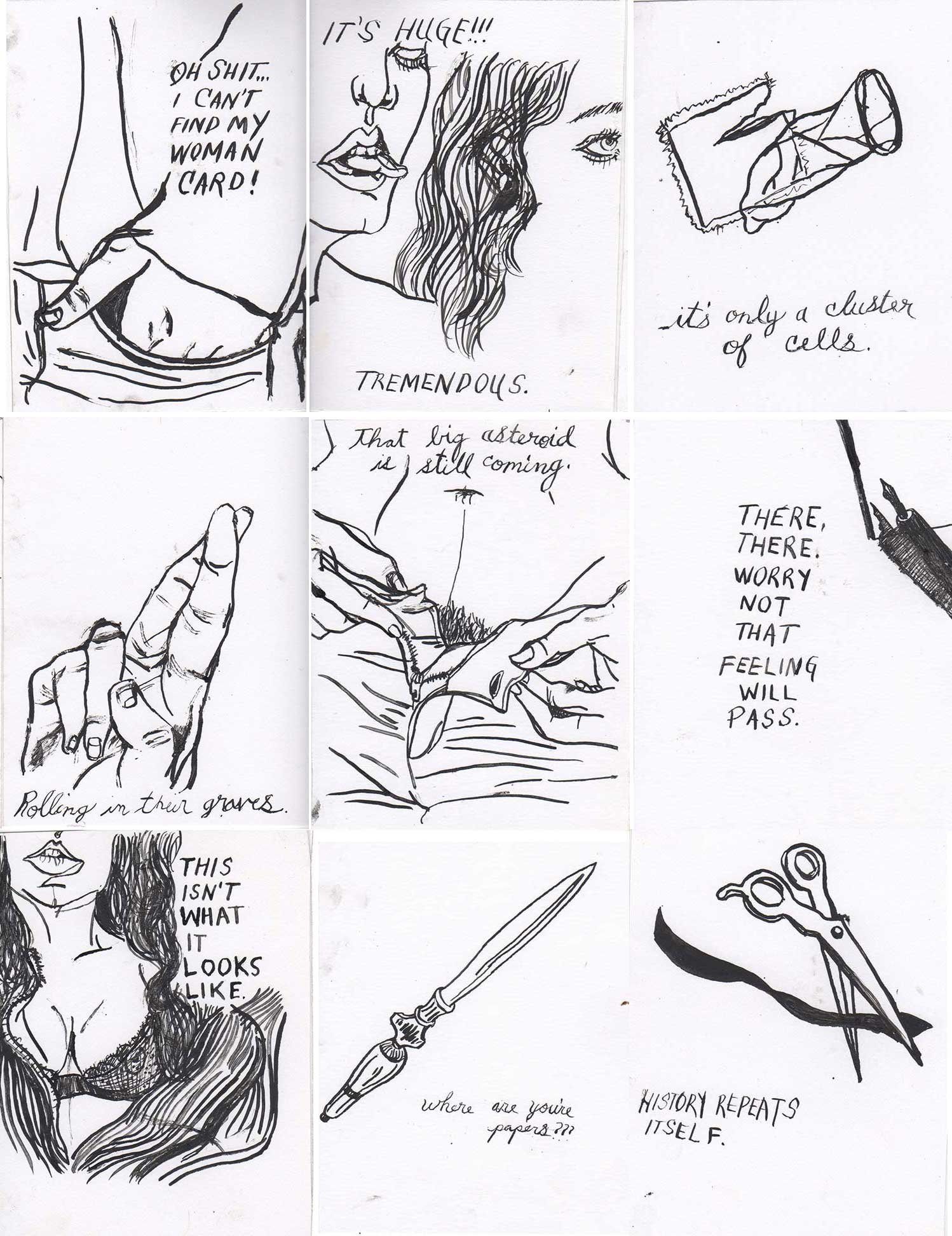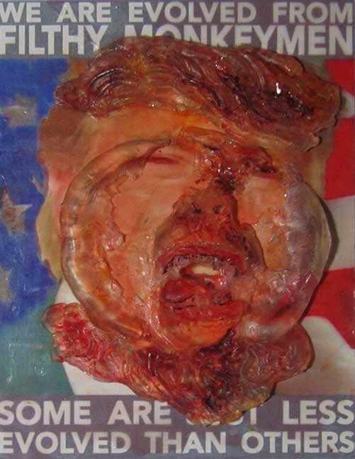 ABE LINCOLN JR. "Fuck This" pen and ink on postal label ADAM SUERTE "Introducing, The Next 4 Years" pen and ink ALEX HEIR "Shit President" xerox on cardstock, edition of 5 - $20 each ALLISON SOMMERS "Mister J" mixed media with collage on paper ALYSSA FANNING "NO WAR" watercolor on paper ANGIE MASON "Cheatos" ink, acrylic and pencil on board ANGIE MASON "Liberties Lost" ink, acrylic and pencil on board ANSIS PURINS "Howl At The Buffoon" ink and sharpie marker ARIK ROPER "Makin' It Great Again" pen on paper AUDREY RYAN "Pills" oil on canvas AYA KAKEDA "Nasty Woman 1" porcelain and ceramic glaze AYA KAKEDA "Nasty Woman 2" porcelain and ceramic glaze AYA KAKEDA "Nasty Woman 3" porcelain and ceramic glaze BECCA GENNE-BACON "Untitled" watercolor and ink BEN CAMPBELL "Tsar Bomba" acrylic and ink on paper BEN CAMPBELL "Eat The Fear" acrylic and ink on paper BEN CAMPBELL "Traditions" acrylic and ink on paper BEN CAMPBELL "Don't Ignore Violence" acrylic and ink on paper BEN CAMPBELL "Evil Days" acrylic and ink on paper BEN CAMPBELL "Troll Empire" acrylic and ink on paper BEN CAMPBELL "Don't Give Into Fear" acrylic and ink on paper BEN CAMPBELL "Leaf Blood" acrylic and ink on paper CHANTAL SMITH "Invisible" black bic pen, acrylic gold marker, fire CHRIS KINSLER "Untitled" collage (framed) CRISTY C. ROAD "Severed Head Of The State" ink, marker and gel pens (framed) DAMARA KAMINECKI "Eagle 2" ink, liquid acrylic DAMARA KAMINECKI "Tiger" ink, liquid acrylic DAMARA KAMINECKI "Eagle 1" ink, liquid acrylic DANIELLA AKA OUR LADY OF PERPETUAL PMS "Deliver Us From Evil" mixed media and collage DREW LINDEN "No Man's Land" liquid acrylic and ink on arches watercolor paper (framed) DREW LINDEN "Lending Hand" liquid acrylic and ink on arches watercolor paper (framed) DREW LINDEN "Suffering Suffragette" liquid acrylic and ink on arches watercolor paper (framed) DREW MAILLARD "Don't Think Your Shit Don't Stink" ink on illustration board DREW MAILLARD "The Awful Truth" ink on illustration board DREW MAILLARD "Visual Aid; The Perspective Of The Oligarchy " ink on illustration board DYLAN SCHREIFELS "I'm Mad As Hell And I'm Not Going To Take It ANYMORE!" ink and watercolor on arches (framed) FERNANDO CARPANEDA "We Stand As One" acrylic on canvas (framed) FLY-O "Goodbye 2016" ink, pencil and watercolor on cardstock FLY-O "Free Speech" ink, pencil and watercolor on cardstock FLY-O "Goodbye 2016 2" ink, pencil and watercolor on cardstock FLY-O "Crime Scene" sharpie and tape on cardstock FLY-O "Future Now Crime" sharpie and tape on cardstock GLENN WERNIG "We Are Evolved From Filthy Monkeymen, Some Are Just Less Evolved Than Others 1" clear resin, mixed media GLENN WERNIG "You Knew He Was A Snake... When You Voted" clear resin, mixed media GLENN WERNIG "We Are Evolved From Filthy Monkeymen, Some Are Just Less Evolved Than Others 2" clear resin, mixed media GRACE LANG "Screw The Boys Club" ink on paper GREG MAILLARD "Jesus Loves You But I May Not" bic pens on paper (framed) GREG MISHKA "A Day Of Death" collage HEATHER GARGON "Trump And Judy" sculpey, fabric and cardboard IAIN BURKE "Built To Last" ink and watercolor on arches watercolor paper JANE KENNEDY "Help Yourself" watercolor (framed) JASON MITCHELL "I Object 1" ink on bristol JASON MITCHELL "I Object 2" ink on bristol JASON MITCHELL "I Object 3" ink on bristol JASON MITCHELL "I Object 4" ink on bristol JENNIFER TROK "Steadfast" watercolor and ink JENNY GONZALEZ-BLITZ "Alma De Bruja" mixed media (framed) JENNY GONZALEZ-BLITZ "Resistance With Love" mixed media (framed) JEREMY HUSH "In The Shadow" biro and watercolor (framed) JUSTIN MELKMANN "Good To The Last Note" sharpie and photoshop (framed) JUSTIN MELKMANN "80s Night" sharpie and photoshop (framed) JUSTIN MELKMANN "Rock-A-Rolla Car-A-Showa" sharpie and photoshop (framed) KELLY DENATO "Nasty Woman" digital prints and mixed media on watercolor paper KELLY DENATO "Love Your Fellow Human Beans" digital prints and mixed media on watercolor paper KELLY DENATO "Eat Sh*t With A Smile" digital prints and mixed media on watercolor paper KIRSTEN FLAHERTY "2020" ink on handmade paper KRISTIN RYAN SHEA "Oh Shit... I Can't Find My Woman Card" ink and crowquill on bristol KRISTIN RYAN SHEA "History Repeats Itself" ink and crowquill on bristol KRISTIN RYAN SHEA "It's Huge, Tremendous" ink and crowquill on bristol KRISTIN RYAN SHEA "Where Are Your Papers" ink and crowquill on bristol KRISTIN RYAN SHEA "This Isn't What It Looks Like" ink and crowquill on bristol KRISTIN RYAN SHEA "There,There. Worry Not That Feeling Will Pass" ink and crowquill on bristol KRISTIN RYAN SHEA "Rolling In Their Graves" ink and crowquill on bristol KRISTIN RYAN SHEA "That Big Asteroid Is Still Coming" ink and crowquill on bristol KRISTIN RYAN SHEA "It's Only A Cluster Of Cells" ink and crowquill on bristol LAURA REBEL ANGEL "Earth Vs. The Short Vulgarians" ink and colored pencil on bristol LOU RUSCONI "Madonald" acrylic on heavy duty bristol board (framed) LOU RUSCONI "The Unfits" acrylic on heavy duty bristol board (framed) LUCY KNISLEY "The Game Plan" postcard prints, edition of 50 - $10 each MAGGIE SERPICA "Hola Monkey" acrylic and ink on illustration board MARIE SENA "She's On The Warpath" ink on paper (framed) MARTIN MAZORA "E.N.G.A.G.E." letterpress on 118 lb reich cavoy Cover MARTINA SECONDO RUSSO "2020 (Captain Spaulding)" acrylic on board (framed) MARTINA SECONDO RUSSO "2020 (Leatherface)" acrylic on board (framed) MATT KERLEY "Shoot Me" ink on bristol and cardboard MAX FRACHETTE "Make America Taste Great Again: Bannon" wood cut on watercolor paper MAX FRACHETTE "Make America Taste Great Again: Trump" wood cut on watercolor paper MAX FRACHETTE "Make America Taste Great Again: Wayne" wood cut on watercolor paper MCA "Fight the Rich" ink and copic markers on bristol board MCA "Evil Apes Live In DC" ink and copic markers on bristol board MICHAEL MICHAEL MOTORCYCLE "As if He Were a Prince, Others Will Mount His Stairs and Will Help Him to Descend 