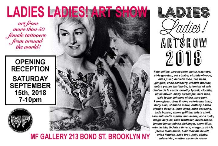 Ladies Ladies Art Show 2018 is the 5th installment of this exclusive group art show, featuring tattoo art by some of the most talented female tattooers from NYC and around the world. The event was born as a platform to show the diversity of art in the feminine universe of professional tattooing. The tattoo scene has been historically a male dominated playground, but in the last 30 yrs or so, the number of women in the tattooing industry has grown exponentially and like never before.Tattooing itself has gone from being a subculture practice to a widespread cultural/social phenomenon. As the number of people getting tattooed has grown, so has the massive presence of many talented women choosing tattooing as their professional career and their creative voice! This exhibit brings together female tattoo artists from different parts of the world, with different styles and backgrounds, carefully chosen to offer a representation of what the contemporary tattoo industry has to offer. It also aims to fill the gap between the old and the new generations of female tattooers, showcasing work from seasoned professionals to newer tattoo artists. Back in 2010, tattooers missElvia and Emma Griffiths had the idea to create an event to support, unite and celebrate the women of the tattoo industry, something they felt was lacking at the time. They also wished to pay tribute to the “old timers” who paved the way- the women who started tattooing more than 30 yrs ago- when a woman tattoo artist was almost unheard of- opening up the doors to a whole new world of possibilities for female artists to come. Respect and tradition are really important in this industry as well as recognition. All the past installments of LLAS have had the support and participation from “old timers” like Vyvyn Lazonga, Pat Sinatra, Michelle Myles, Juli Moon, Debra Yarian or Kate Hellenbrand, just to name a few. Many talented artists throughout the years have participated to the Ladies Ladies Art show, making this a one of a kind event that should not be missed! More than 50 artists have been chosen for this year show. Original artwork and prints will be for sale in a wide range of prices. This year artists list include names like Kari Barba, Debra Yarian, Virginia Elwood, Anna Melo, Denise de la Cerda, Dawn Cooke, Rose Whittaker, Lara Scotton, Drew Linden, Jen Carmean, Holly Ellis, Katie Gray, Jackie Dunn Smith, and many more, to cover different styles and represent the vast universe of art and tattooing, with a particular eye to the international NYC tattoo scene. We hope the Ladies Ladies Art Show will continue to inspire all women, tattooers and artists in general and to create a space for them to meet and celebrate each other (together with their fellow male artists), while keeping the tradition of tattooing alive and kicking! Many of the featured artists will be in attendance at the opening party. Admission is free and open to all ages. Refreshments will be served. MF Gallery is located at 213 Bond Street, between Baltic and Butler Streets in the Gowanus neighborhood of Brooklyn. Take the F or G to Bergen St., the A or C to Hoyt/ Schermerhorn, or the R to Union. The artwork can also be viewed and purchased online at: www.MFgallery.net/LLAS/LLAS.html After opening night, the show will be open by appointment only, until October 13th, 2018. Email info@MFgallery.net or call (917)446-8681 to schedule a visit, or for any other inquiries. |