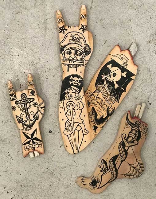 “Tattooed Limbs” acrylic and enamel on hand-cut plywood $150 (large), $100 (small)