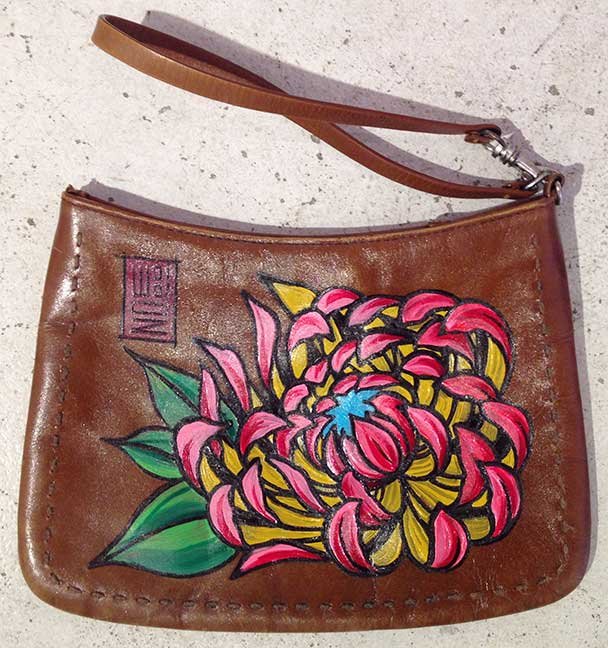 “Untitled” tattoo and acrylic on leather purse (9"x7", 7" handle) $200