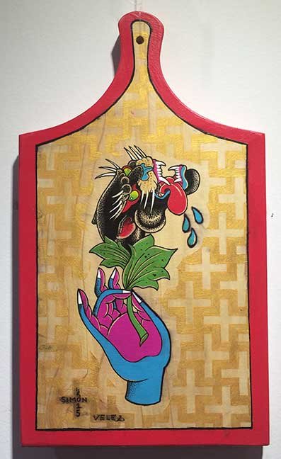 “Untitled” acrylic and tattoo ink on cutting board (13.5x7.5") $300