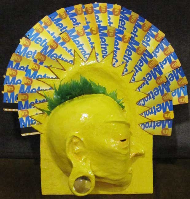 "New Yolk” recycled paper, wood board, sushi "take a way" decoration, metrocards, acrylic paint