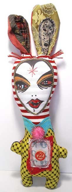 “Bunniculaura” fabrics, buttons, embroidery, polyfill, printed face (4”x13”)