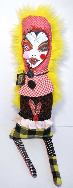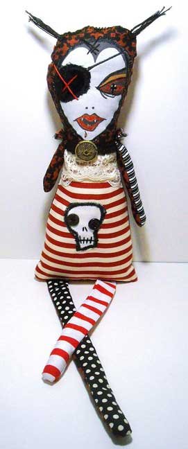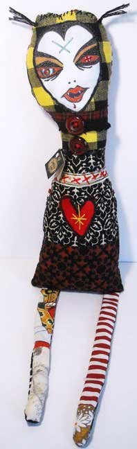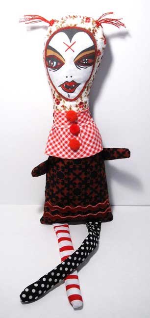 “Scarlett” fabrics, buttons, embroidery, polyfill, printed face (4”x20”)