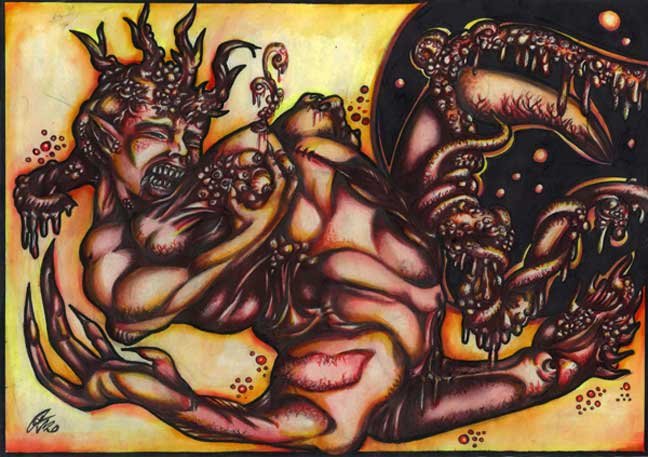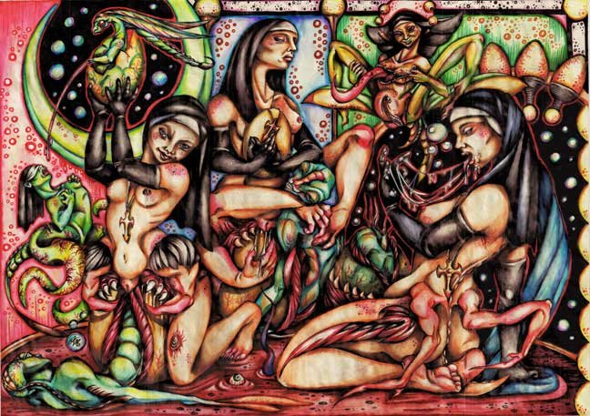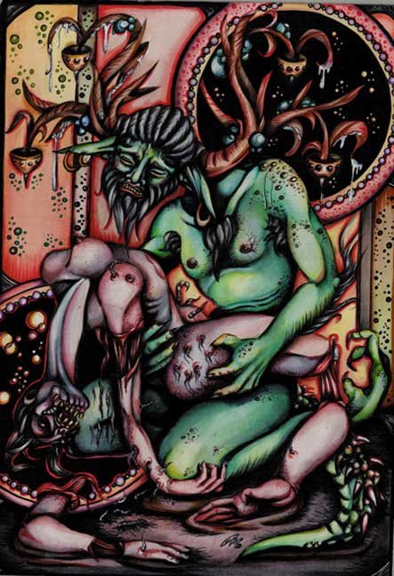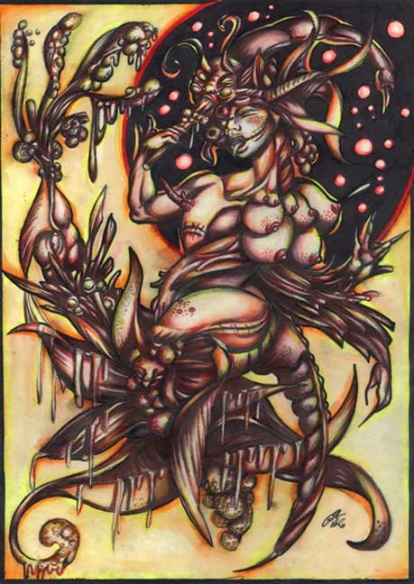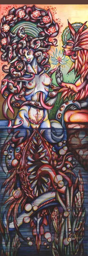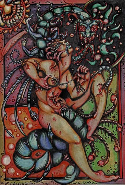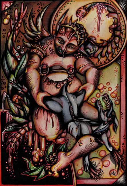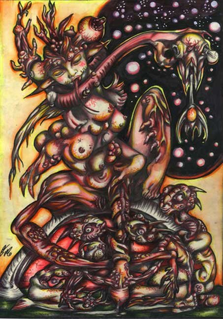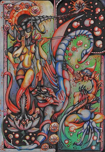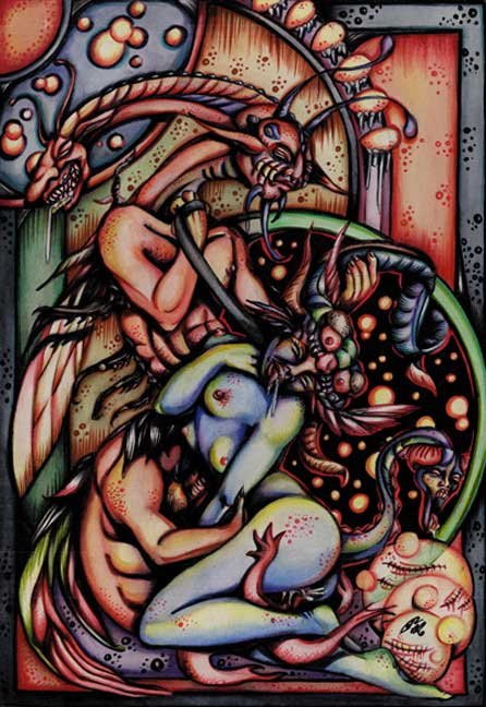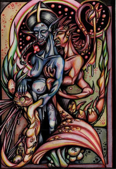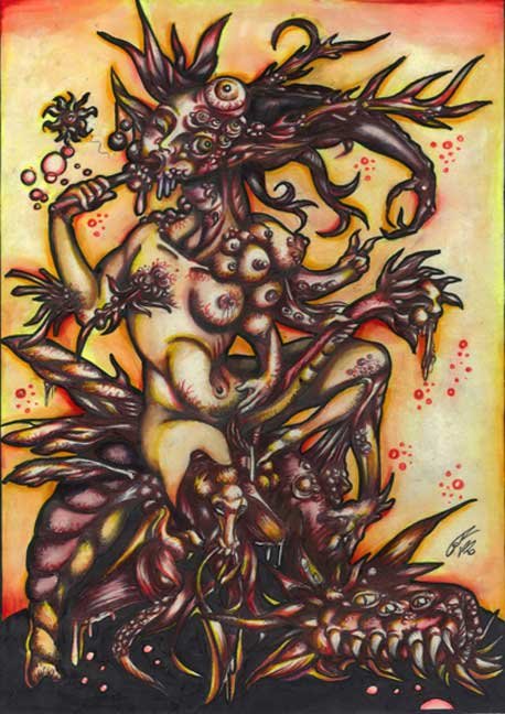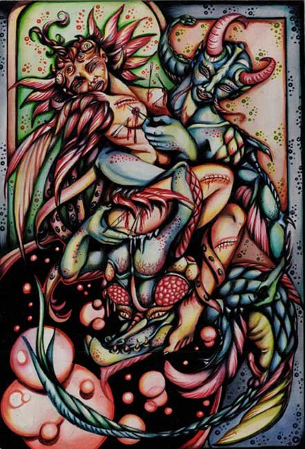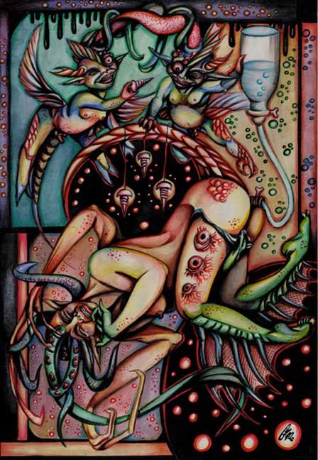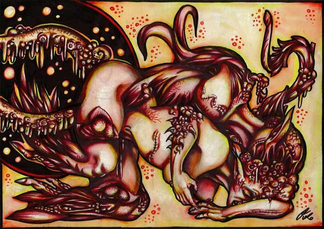Modena, ma cresciuta nei pressi di Genova. L’artista opera prevalentemente su materiali cartacei, con le più disparate tecniche grafico/pittoriche, prediligendo l'acquerello, la grafite e gli inchiostri. La sua, sia a livello tecnico che tematico, è una ricerca all'insegna dell'ibridazione e della sperimentazione. Affascinata fin dall'infanzia al tema del metamorfismo e delle deformazioni, rappresenta assemblaggi di corpi dal gusto fortemente iconografico e decorativo, e dal carattere prevalentemente femminino. Il suo quesito di base è sempre: fino a DOVE è consentito spingersi con l'immaginazione? O meglio: esiste un DOVE? Il progetto "Paraphilia Onirica" si connette al desiderio provocatorio di imporre allo spettatore una presa di coscienza di qualcosa di comunemente inammissibile. Le deviazioni sessuali, argomento controverso e "taboo", vengono qui esemplificate all'interno di un contesto mentale, fluttuante: per quanto forte sia la tematica affrontata, essa viene in qualche modo "smorzata" e resa più facilmente approcciabile dal pubblico, grazie alle cromie variegate e all'armonia costruttiva dei soggetti. I pezzi in mostra si possono acquistare contattando MF Gallery via mail: mfgallerygenova@gmail.com MF Gallery Genova si trova a un passo da Via Garibaldi: Vico dietro il coro della Maddalena 26A. L'orario della galleria e` dal lunedi` al venerdi (h. 12,30/14,00 e 19,30/22,00) e al sabato (h. 19,30/22,00). MF Gallery, una delle migliori gallerie di New York nel mondo del Pop Surrealism/ Underground Pop Art, e` presente a Genova dal gennaio del 2009. Il piano superiore di MF Gallery Genova ospita una collezione semi-permanente con opere di piu di 20 artisti internazionali appartenenti al movimento. |