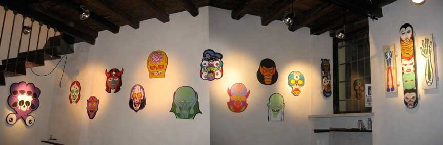 newyorchese, co-propietario della nuova MF Gallery Genova Frank Russo è un artista di Brooklyn, NY, che disegna fumetti da quando aveva 9 anni. La sua arte unisce l'amore per la “trash culture” e la “fast music”, con una grande varietà di stili e forme: fumetto, pittura, toys, sculture e costumi. Per la sua prima mostra personale in Italia, Frank Russo presenta una nuova serie di quadri in acrilico su legno... mostri colorati e psichedelici... spaventosi e simpatici... teschi, alieni, robot, streghe... immagini pop, legate alla cultura dello skateboard e dei cartoni animati. Tutti questi nuovi pezzi sono stati prodotti durante la sua permanenza a Genova, e sono quindi ispirati dai colori, suoni e personaggi della “Superba”. Al piano superiore della galleria, resta aperta la collezione semi- permanente di MF Gallery Genova, con opere di piu’ di 20 artisti internazionali del "Pop Surrealism" e "Lowbrow Art".