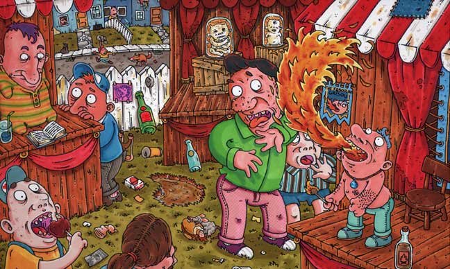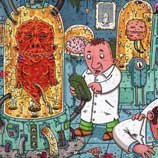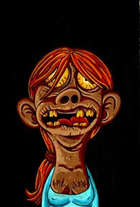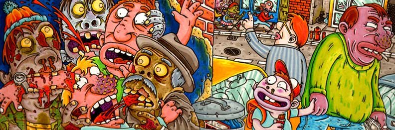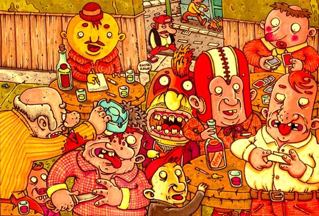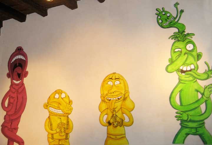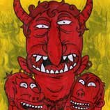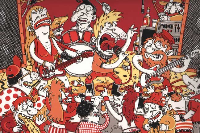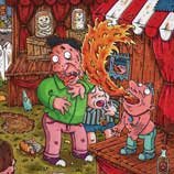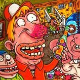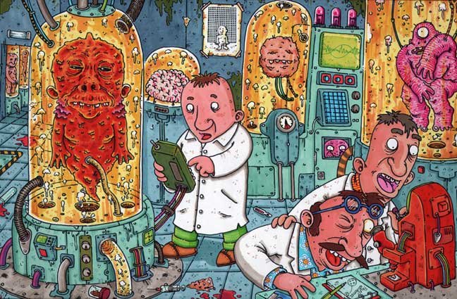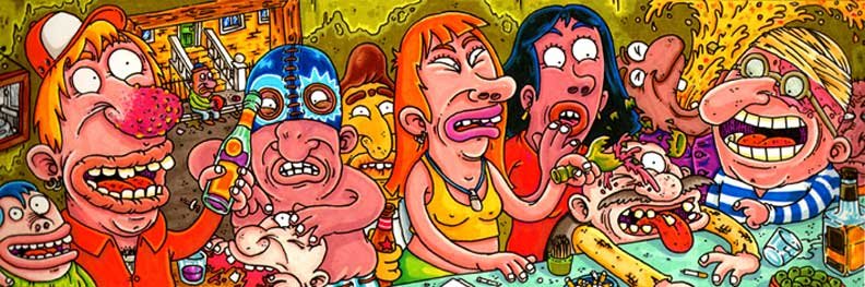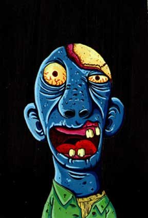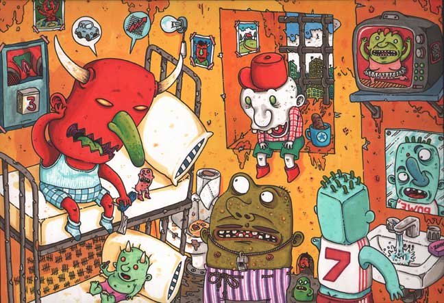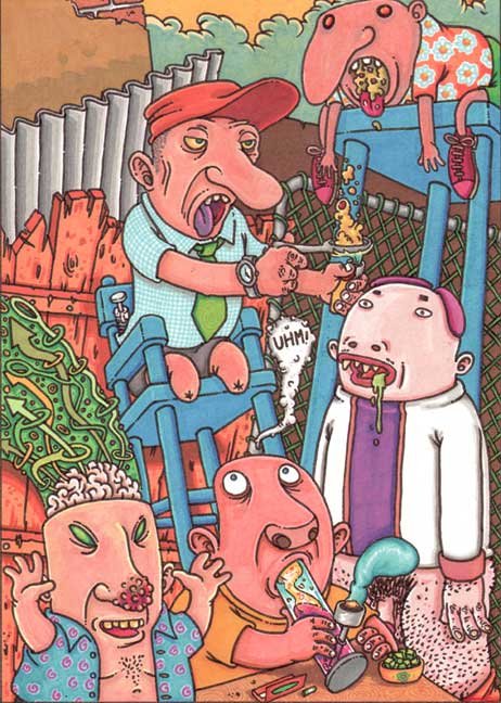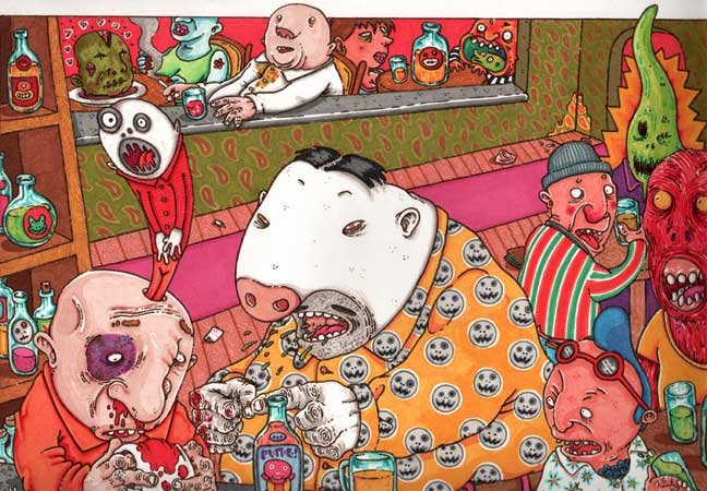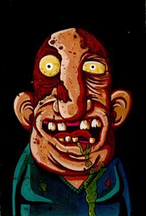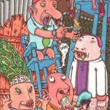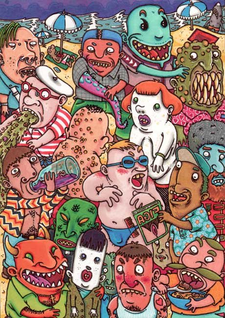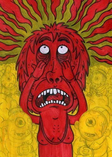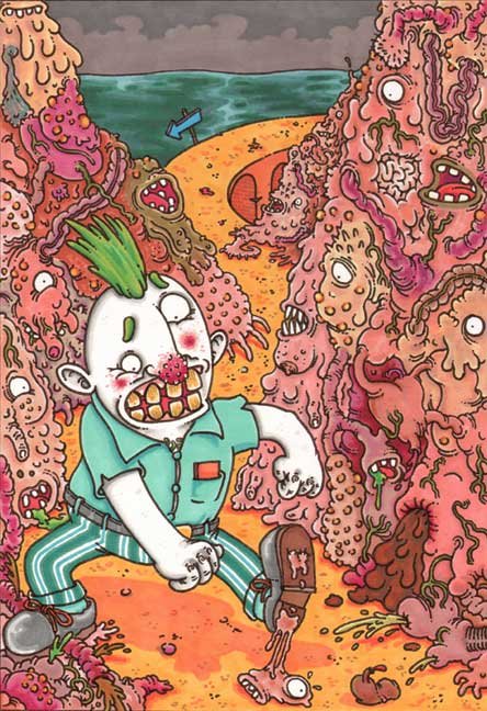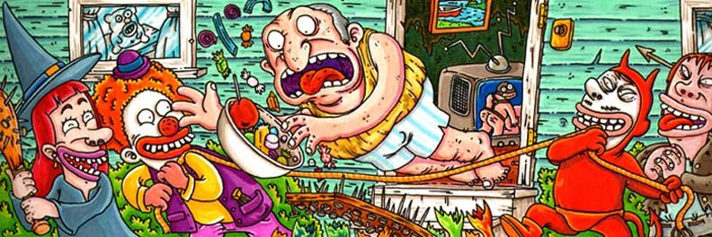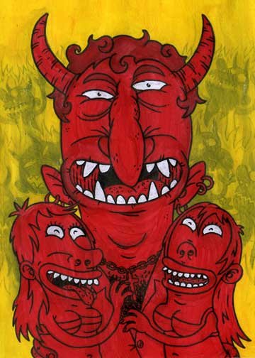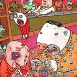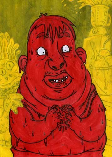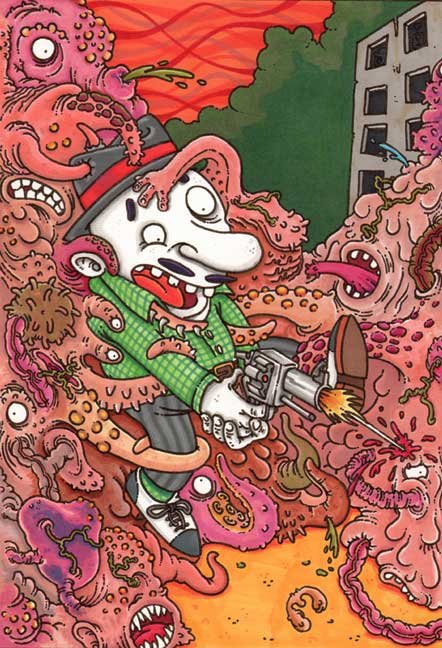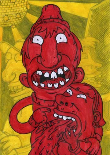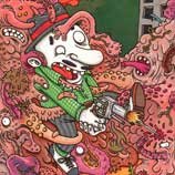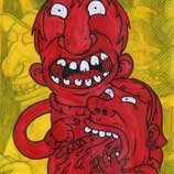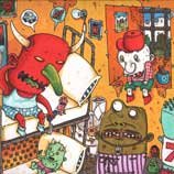 Macchiavello is one of Italy's top contemporary illustators, having realized projects for such big name clients as Ceres Beer and "U Giancu's Famous Comic Book Restaurant", along with many others. He is the character designer for "Skifidol", Italy's wildly popular trading cards. (Produced by Officina Comunicazione, società modenese, owner of the "Skifidol" trademark) He defines himself as a combination between Hyeronimus Bosch and Jacovitti, Caravaggio and Papa Smurf, mixed in a nauseating ecstasy. Enrico Macchiavello was born in Genova, gew up playing with colors and later studied at the Scuola del Fumetto in Chiavari, and the Accademia Ligustica di Belle Arti in Genova. He was one of the founding members of La Fantomatica, a graphic design firm which has worked on many projects from web design to animation, advertisements, to band art and more. In 2000, he was the winner of the prestigious "Premio Andersen" for the best multimedia children's product and in 2006, he received the "U Giancu" prize in the "Mostra Internazionale dei Cartoonis". He has shown his work at Violabox Gallery and at numerous other venues in Italy and has worked with MF Gallery both in Genova and in New York. Macchiavello reached international fame when he worked with Ceres beer on a series of TV spots in 1999. His monstrously funny and unique characters made his style easily recognizable by a wide variety of people, and his signature cartoonishly hideous drawings oozed, dripped and disgusted his way into many people's hearts. In 2008, he illustrated the "Skifidol" trading cards for Officina Comunicazione, a Company from Modena, owner of the concept and registered trademark: "Skifidol". Macchaivello: