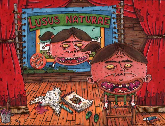 Macchiavello e` uno degli illustratori Italiani piu` conosciuti del momento ed ha lavorato per clienti importanti come la Birra Ceres ed il ristorante dei fumetti U Giancu di Camogli. E` il disegnatore delle "Skifidol Cards" (Realizzate per conto di Officina Comunicazione, società modenese, proprietaria del marchio e del concept "Skifidol"). Descrive se stesso come una combinazione di Hyeronimus Bosch e Jacovitti, Caravaggio ed il Grande Puffo, mischiati in una nauseante ecstasi. Enrico Macchiavello e` nato a Genova, cresciuto giocando coi colori e piu` tardi ha studiato alla Scuola del Fumetto di Chiavari, e all'Accademia Ligustica di Belle Arti a Genova. E` stato uno dei membri fondatori de La Fantomatica, societa` che fornisce servizi e prodotti grafici applicabili a vari media: editoria, web e broadcast. Nel 2000 ha vinto il prestigioso "Premio Andersen" per il miglior prodotto multimediale per ragazzi. Nel 2006, ha ricevuto il premio "U Giancu" della "Mostra Internazionale Dei Cartoonis". Ha esposto le sue opere alla Violabox Gallery a Genova ed in numerose altre mostre in giro per l'Italia. Ha gia`lavorato precedentemente con MF Gallery sia a New York che a Genova. Macchiavello ha raggiunto la notorieta` internazionale nel 1999 con gli spot pubblicitari e con il merchandising legati alla Birra Ceres. I suoi personaggi cosi` singolari e mostruosamente buffi hanno reso il suo stile famoso e riconoscibile per una grande varieta` di persone e i suoi disegni sono entrati gocciolanti e scivolanti nel cuore di gente di ogni eta`. Nel 2008, ha realizzato le illustrazioni delle Cards “Skifidol” per conto di Officina Comunicazione, società modenese, proprietaria del marchio e del concept "Skifidol”. Macchaivello: "Mostr-O-Rama" sara` in mostra dal 16 gennaio al 20 marzo, 2010. Per ulteriori informazione e/o acquisti, contattare: MFgalleryGenova@gmail.com |