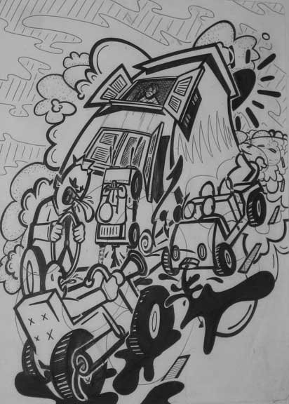 "Grosse macchine vomitano catrame dai tubi di scarico. Qualcuno suona il clacson,
