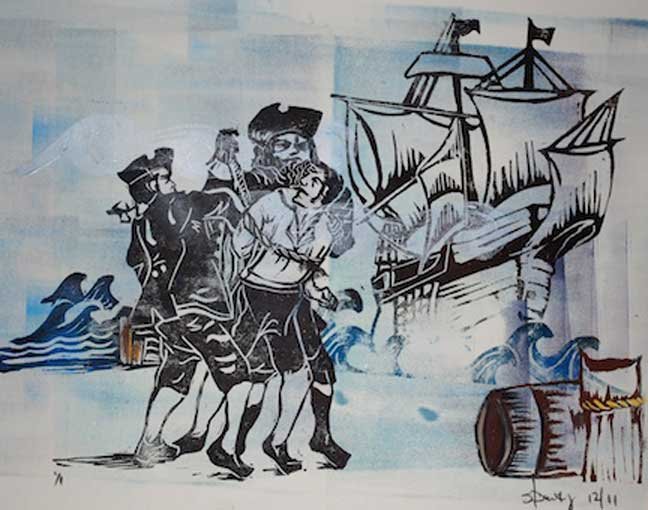"Enlisting for Trafalgar: The Press Gang" stampa linoleum e inchiostro, edizione 1/1 / linoleum print and ink, edition 1/1 (11"x13", framed / 33x28cm in cornice) € 200