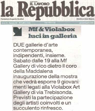 GALLERY GENOVA PRESENTA: MF e Violabox: un’amicizia nata spontanemente dall’amore per l’arte. Due gallerie indipendenti, che espongono artisti diversi, nessuna della due compromettendo la loro visione per un mercato dell’arte attento unicamente alla logica del profitto. MF Gallery Genova, succursale della galleria newyorchse, aperta da pochi mesi nel centro storico di Genova. Vilabox Art Gallery, attiva dal 2006 in Via Trebisonda, ma anche facendo mostre in altri spazi intorno alla città. Ignorando lo spirito di concorrenza che purtroppo esiste tra molte gallerie d’arte, MF e Violabox hanno deciso di collaborare su questa mostra, dando la possibilità a dei giovani artisti Italiani di avere un po` di esposizione al pubblico internazionale. Macchiavello