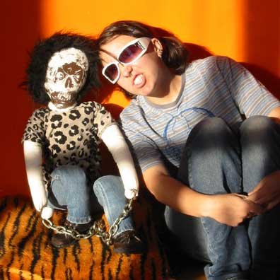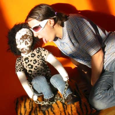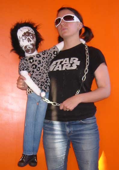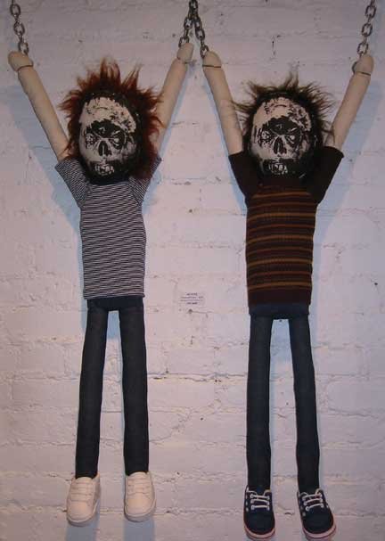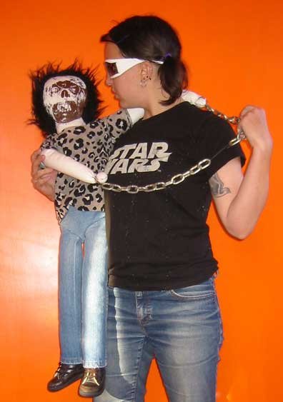 Tortured Trevor is made of fabric, faux fur and other mixed media. His face is screen printed, his body and clothing are hand- sewn.