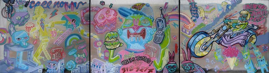 “Cash Flow” AKA “Call Uncle James” Acrylic and Enamel on Plexiglass $100 each / $250 set of 3