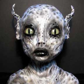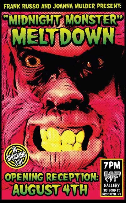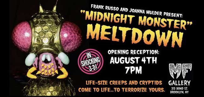 Gallery: 213 Bond St. Brooklyn, NY 11217 Imagine if the Carnival Spookhouse culture had never died out... What would be the natural evolution of this type of entertainment? Join Brooklyn Artists Joanna Mulder and Frank Russo as they revisit the Spookshow Era to invoke some of those old school monster feelings. Both artists are known for their colorful and horrific 2-D artwork in the form of drawings, prints and comic books. For this show, they have embarked on a brand new journey that will take us down the darkest roads of gore, the supernatural, and all things unknown. Witness Frankenstein, larger than life! Stand in awe of the giant blood dripping face, protruding from the wall! Behold the latest incarnation of The Creature From the Black Lagoon! Stumble in fear as you encounter Aliens dripping and oozing in blacklight pus, and look into the eyes of Death Itself! "Midnight Monster Meltdown" provides a visual explosion comparable to being high on LSD, trapped on a roller coaster inside an old time Spook House that never ends... All this and more only at MF Gallery! Joanna Mulder is a Brooklyn-based artist, whose work mixes dark imagery with bold, bright colors and cartoonish distortions. Her work is immersed in the realms of science fiction, horror, and pulp comic book culture, bringing to life nightmare creatures from the depths of pure imagination with blatant references to the psychedelic, altered states of consciousness, and a twist of sideshow panache. As a full-time illustrator and character designer in NYC, Joanna has honed her skills in 2D work, and over the past decade has created hundreds of characters, for anything ranging from children’s products to animated shorts. Joanna has recently started embracing a new medium to showcase her macabre menagerie, in the form of 3-dimentional sculptural works, making her visions manifest themselves in real space and time. Frank Russo's art fuses a life-long love for trash culture and fast music with a wide variety of styles and media such as comics, paintings, toys, props and costumes. Aliens, Monsters, Robots, Skeletons, Hideous Beasts, Witches and Grizzly Ghouls are all subjects of his psychedelic brightly colored artworks. One of Frank's most recent projects is a performance art death metal band called DETHRACE. 10 foot tall fiberglass Super Robots play 666 volts of ear- blasting Heavy Metal! Frank designed and built all the costumes, and fronts the band as "Mecronos". Building these Robot costumes, as well collaborating on props for the band GWAR, has inspired Frank to build the new life sized monsters shown in "Midnight Monster Meltdown". All of the sculptures in "Midnight Monster Meltdown" are for sale, and can also be viewed and purchased online at: http://mfgallery.net/Mulder-Russo/Mulder-Russo.html The show will be on view until September 25th by appointment only. Contact Martina Secondo Russo by phone: (917)446-8681 or email: info@MFgallery.net to make an appointment to see the show. MF
