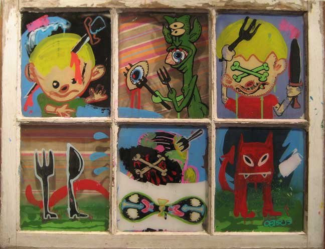 “Alien Ate My Eyeballs” Acrylic, Enamel and Fabric on Industrial Window- 32" x 25" $200