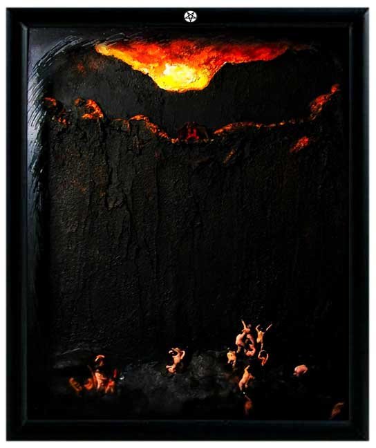 "Dante`s Inferno" clay sculpture, shadow box and acrylic (15"x12"x2") $3000
