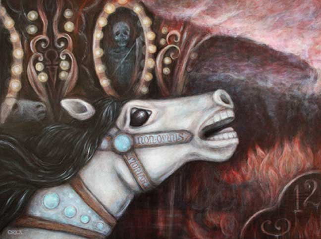 "A Carnival Of Death At The End Of Time (La Fin Du Monde!) acrylic and water soluble oil on wood (16”x12”) $1100