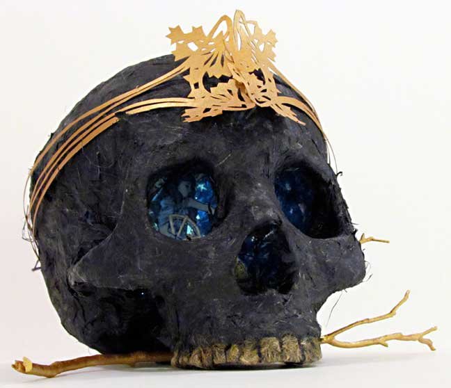 "Vanitas II: Compendium 1” mixed media- paper skull diorama, led light (8”x6”x5”) $1400