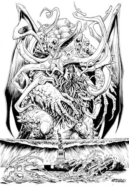 "Cthulu Enters New York Harbor 2012” ink on illustration board (11”x17”) $350