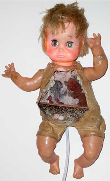 “Lonely Doll” Assemblage, Clay and Acrylic with Light $250