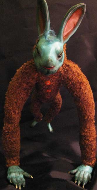 ![]() “Edgar” paperclay, wire armature, fabric, mohair lock, glass eyes (12.5” high) $350 |