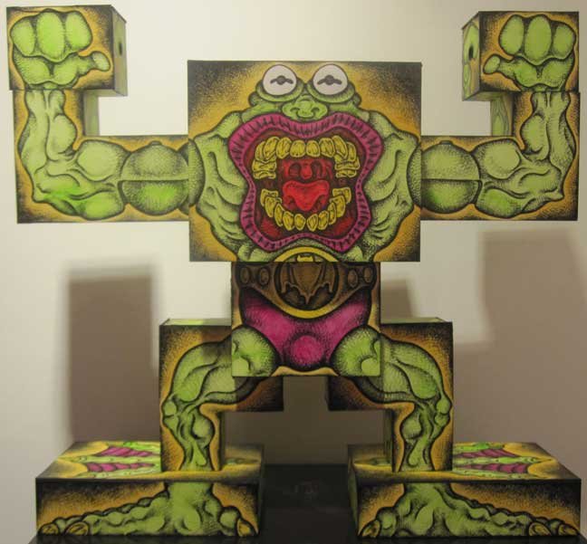“Inaction Figure #3:Mongor, The Consumor” ink and watercolor on illustration board, mounted on wood (12"x14”x6”) $600
