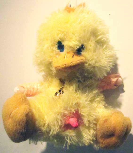 found stuffed animal, paper, nail polish, acrylic nails, metal skull chain