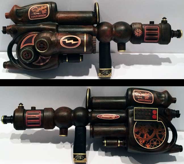 “THE SPECTROLUX PERSONAL HAND CANNON" recycled materials, acrylic paint, air-dry clay, wood, gold trim, decoupage (36"x14") $200