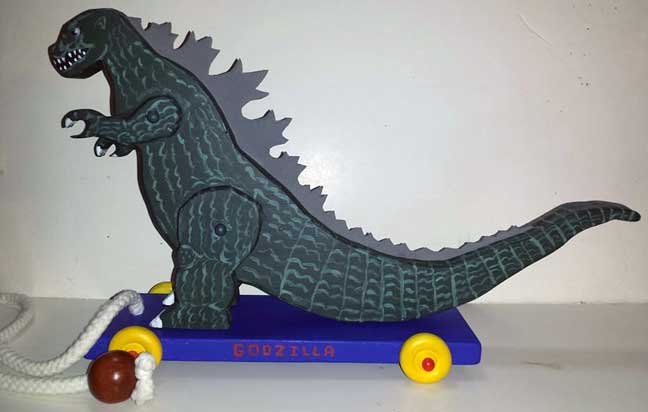 “GODZILLA WOODEN PULL TOY" wood, craft foam and acrylic paint (10"x17.5"x 6") $100