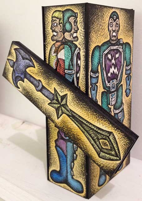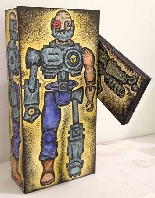 ink and watercolor on illustration board, wooden armature, magnets (6.25”x3”x1.5”)