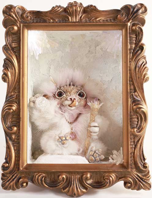 "The Snow Oracle” sculpey, rabbit fur, quartz crystal, glass eyes $225
